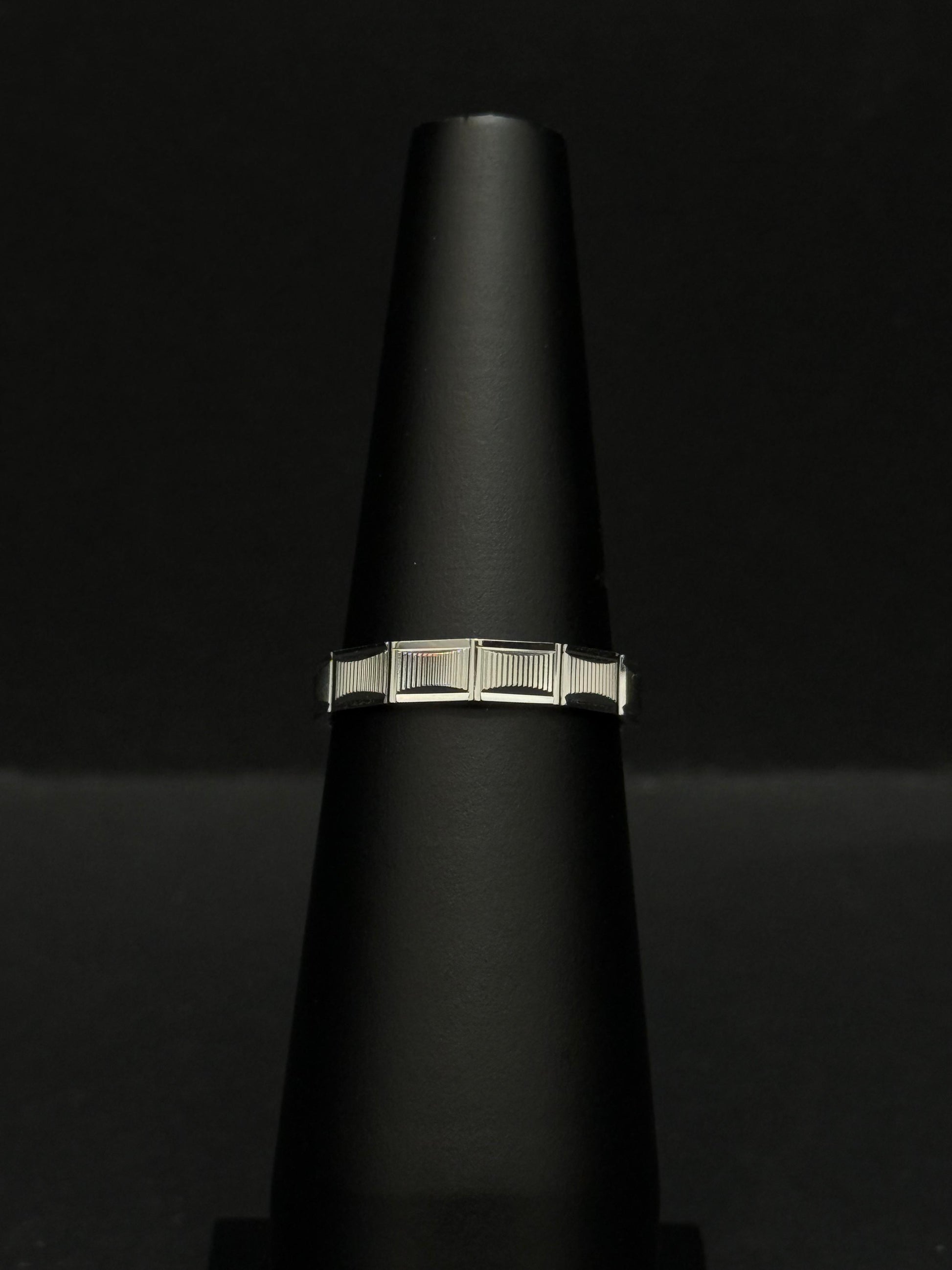 This unique and modern ring features a series of three raised, rectangular bars across the top of a polished band. The two outer bars are set with a pattern of vertical lines of sparkling diamonds, while the central bar has a clean, polished finish with a subtle, ribbed texture. The geometric design gives this ring a structured, architectural feel, making it a distinctive statement piece