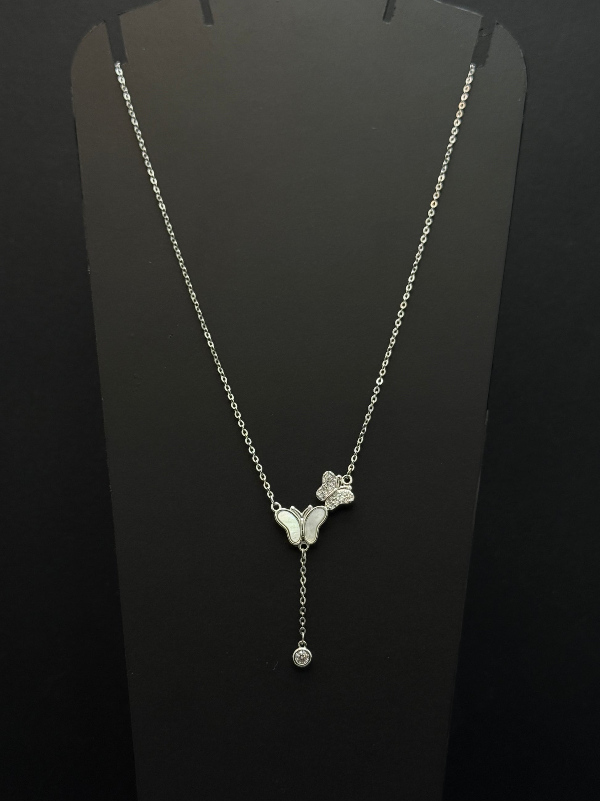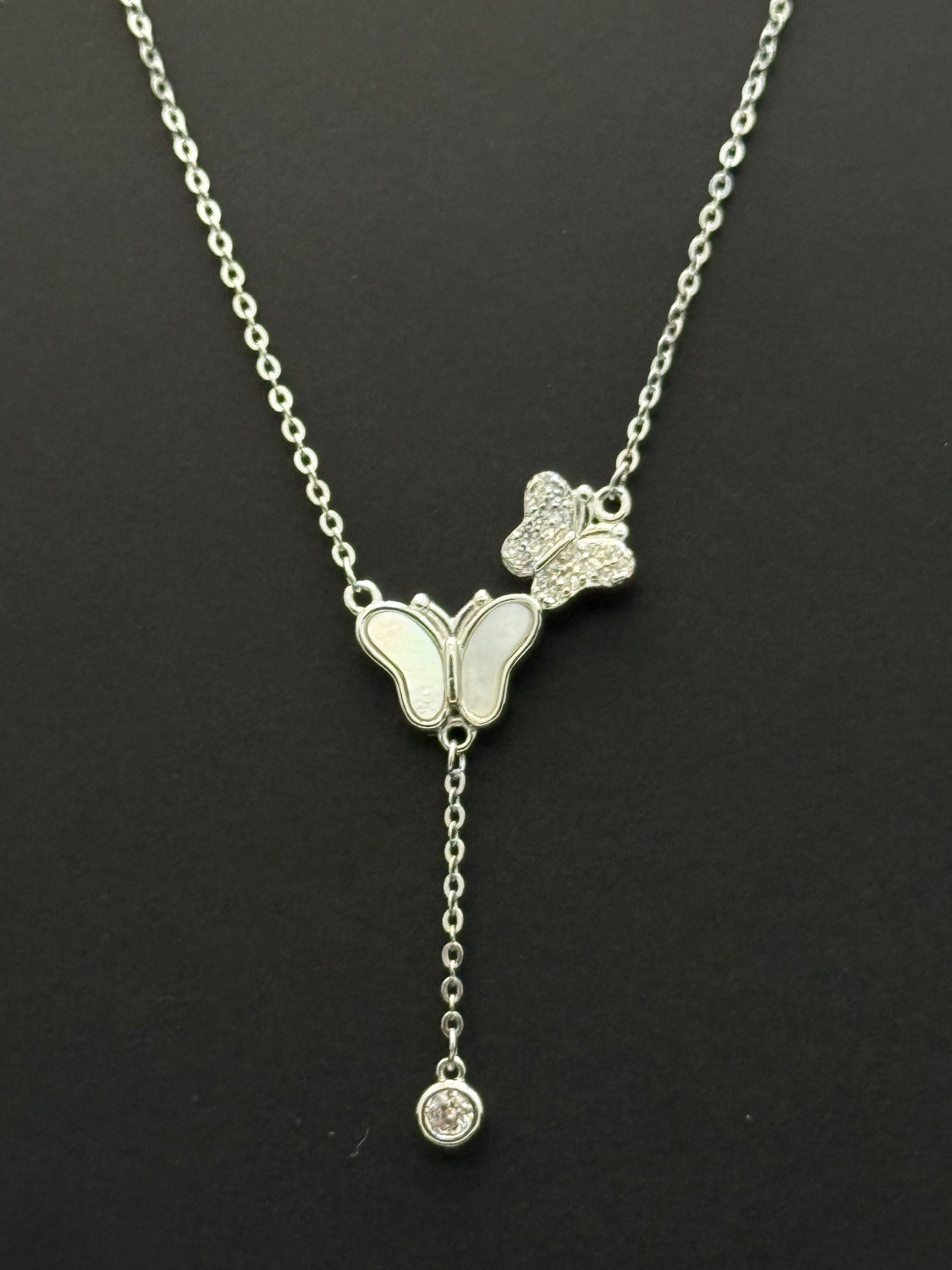 Symbolizing transformation and beauty, the Butterfly Duet Lariat Necklace is a uniquely charming piece. It features two delicate butterfly pendants—one with a luminous, mother-of-pearl finish and the other encrusted with shimmering cubic zirconia stones. The design is finished with a sleek drop chain that holds a single sparkling stone, creating a graceful lariat effect. This necklace is an eye-catching and elegant accessory that will elevate your style.