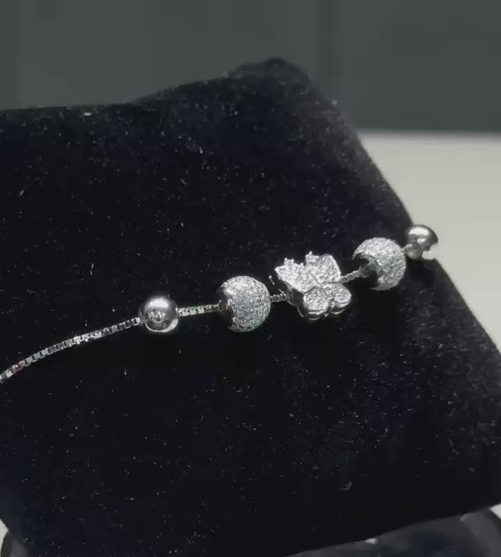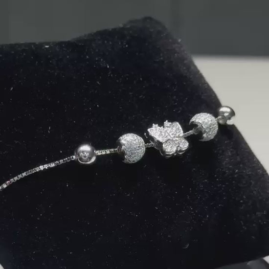 The bracelet is adorned with a captivating assortment of sliding charms. At its center is an exquisitely detailed butterfly charm, entirely encrusted with numerous small, brilliant-cut clear gemstones, likely cubic zirconia or diamonds. The pavé setting allows the butterfly to shimmer with every movement, creating a focal point of intricate beauty.