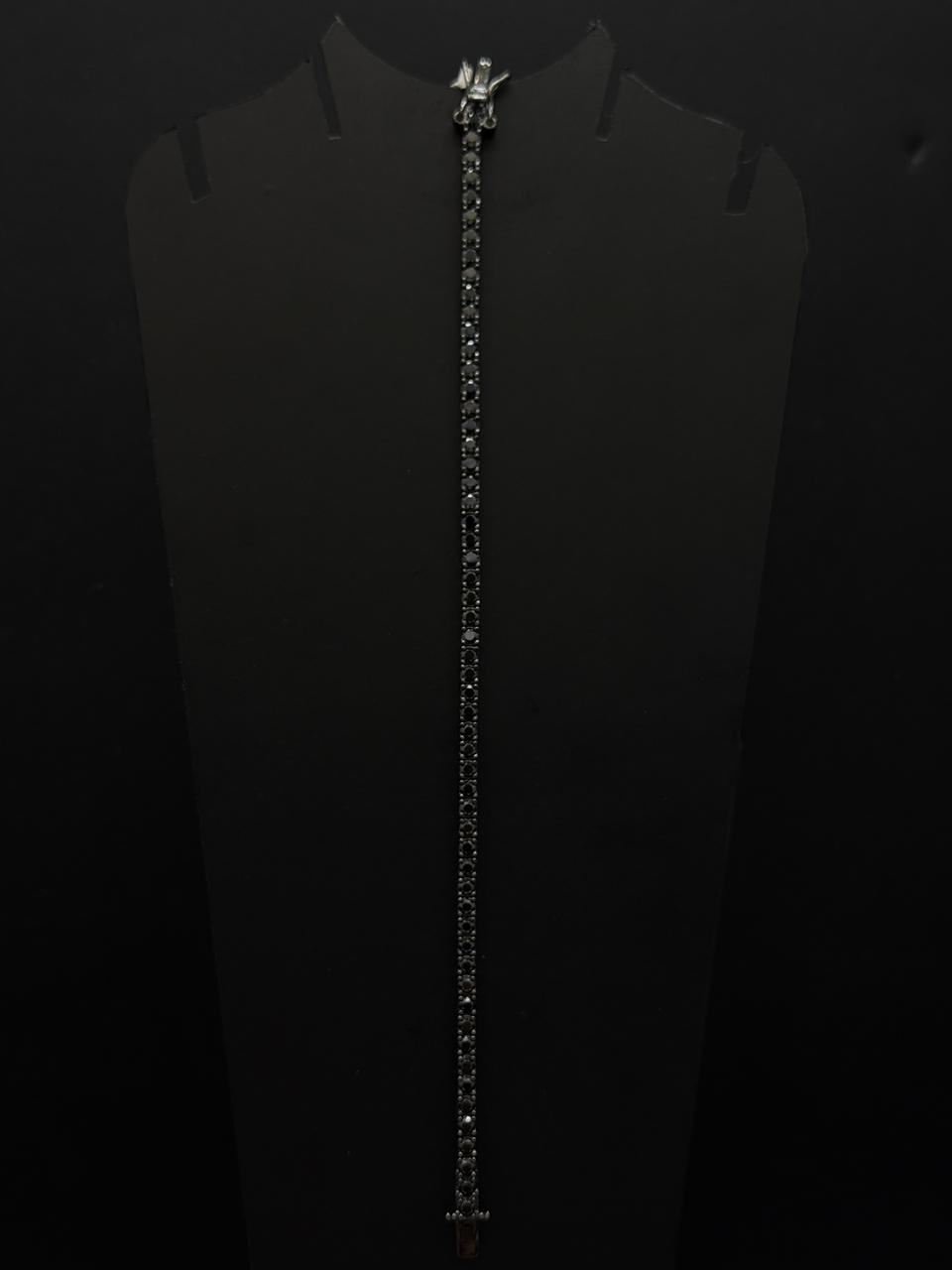 This is a bold and glamorous take on the classic tennis bracelet. It features a continuous, flexible line of small, round-cut black cubic zirconia (CZ) stones, individually set in a dark or silver-tone mounting.