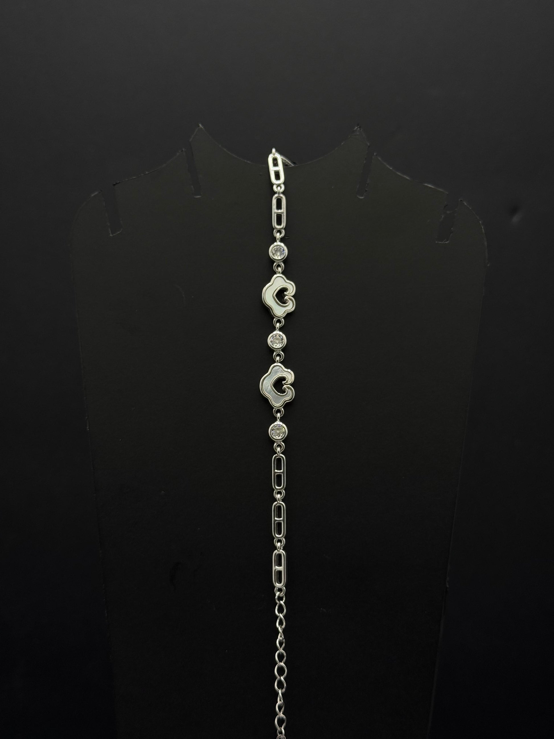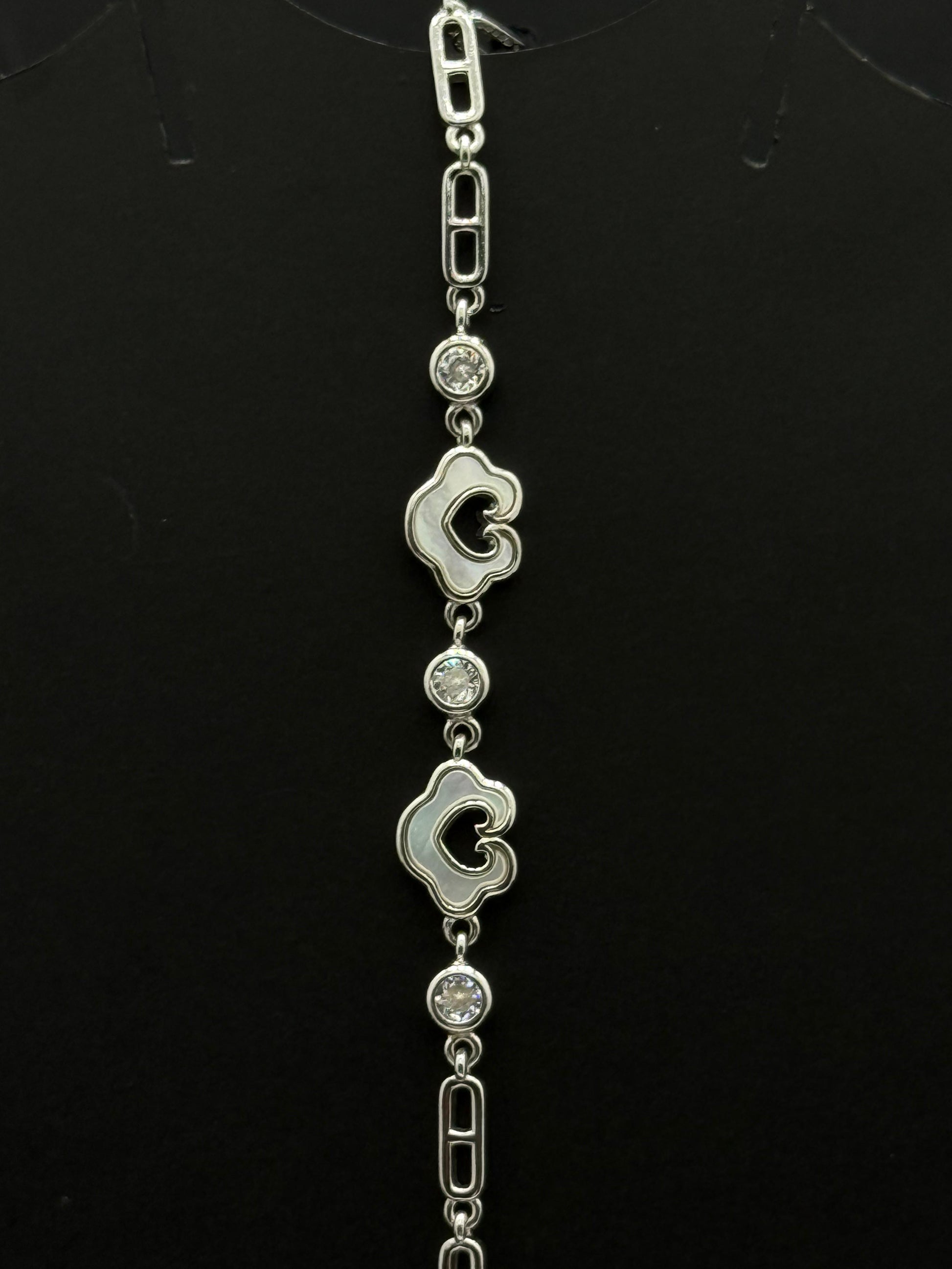 The design features a varied chain, starting with a classic rounded link chain at the top, transitioning into larger, elongated, rectangular or oval links in the upper middle section. This variation in link styles adds visual interest and texture.Central to the design are three prominent, highly polished elements, each shaped like a stylized heart or an abstract organic form with a smooth, dark surface, possibly made of onyx, dark enamel, or polished metal. These heart-like elements are interspersed with smaller, round, dark beads or links, further segmenting the design.
