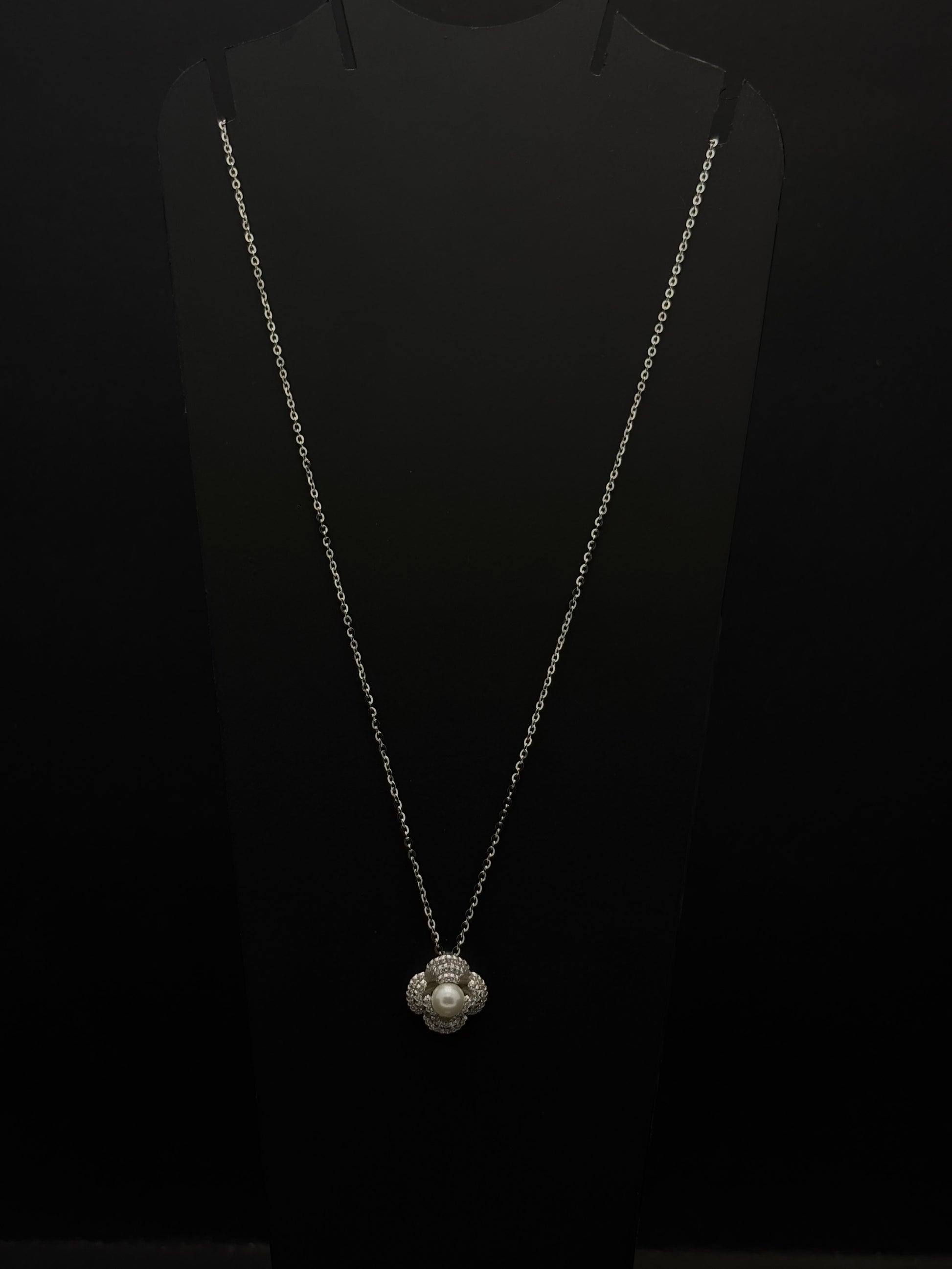 This beautiful necklace features a delicate silver-toned chain gracefully suspending a charming flower-shaped pendant. At the heart of the blossom lies a lustrous white pearl, radiating a soft, natural glow. Each petal of the flower is exquisitely adorned with shimmering pavé-set crystals, creating a dazzling sparkle that beautifully frames the pearl. This piece combines classic elegance with contemporary design, making it a versatile accessory for adding a touch of sophisticated charm to both everyday wear and special occasions.