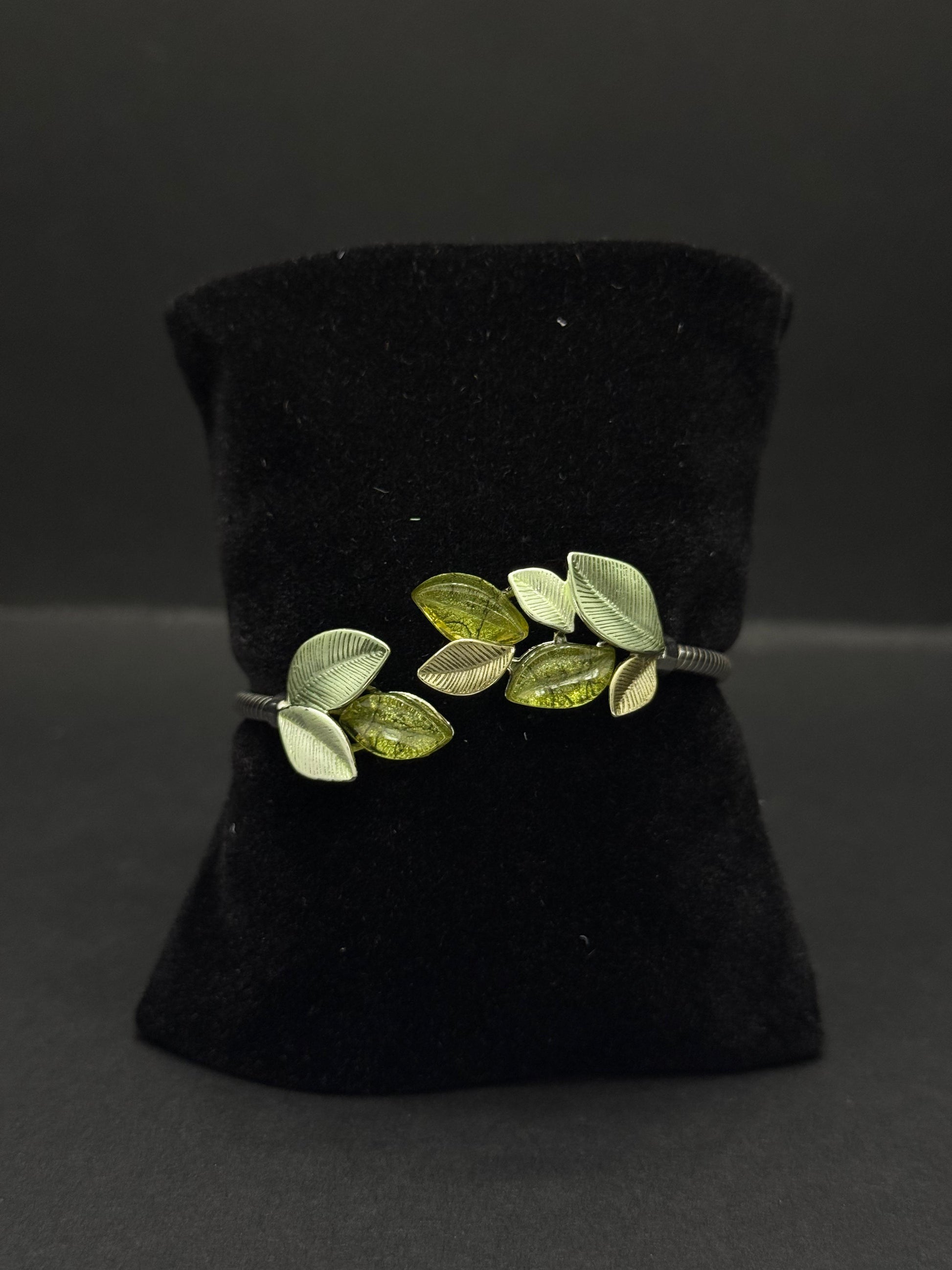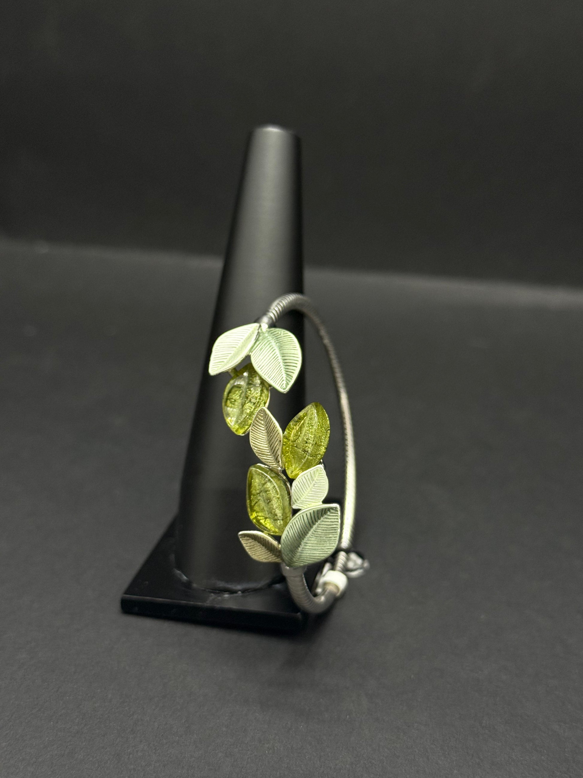 elegant piece of jewelry is a silver-tone bracelet or cuff, featuring a nature-inspired design. It is adorned with beautifully detailed metallic leaves, crafted with visible veins that give them a realistic texture. Interspersed among these silver leaves are several faceted, olive-green beads or stones, which resemble small berries or fruits, adding a pop of natural color and sparkle. The overall design evokes a sense of organic beauty, perhaps a vine or a branch. The piece is set against a dark, possibly black, background, which makes the metallic sheen of the leaves and the rich color of the green beads stand out prominently.