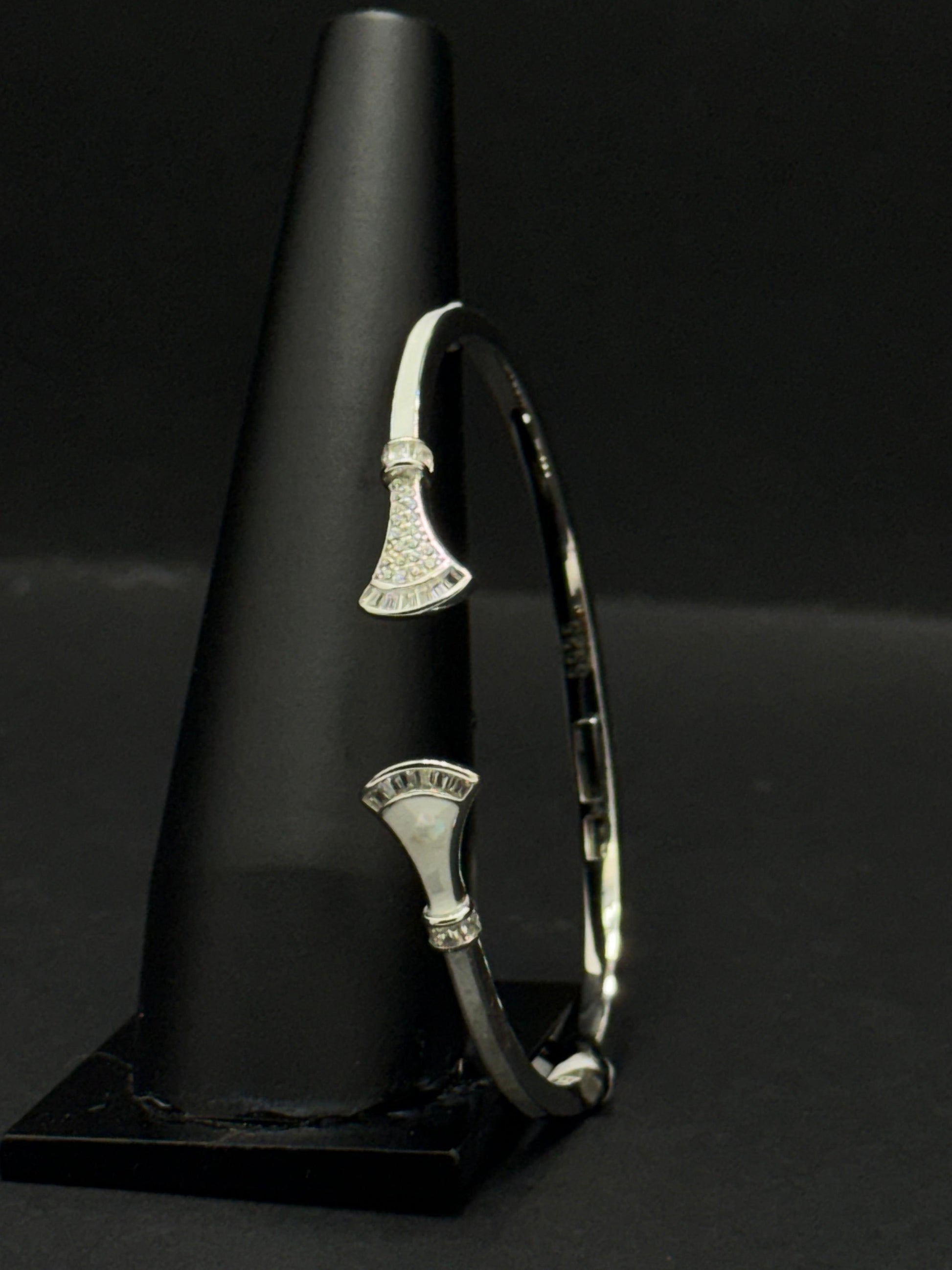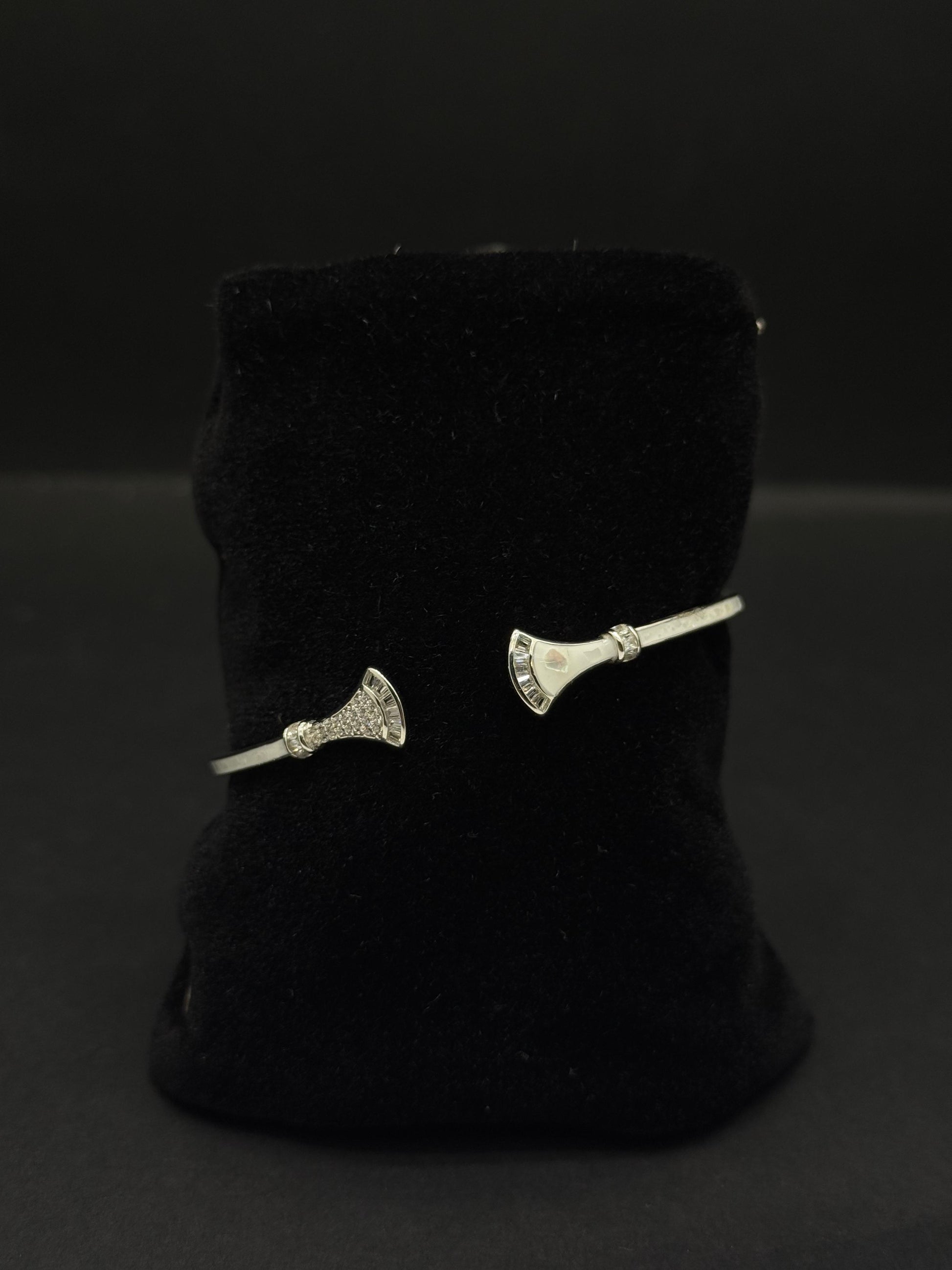 elegant piece is a silver-tone open-cuff bracelet, designed with a sleek and modern aesthetic. The ends of the cuff are distinctively adorned: one end features a section intricately paved with sparkling clear stones, adding a touch of brilliance. The opposite end is tipped with a luminous, smooth material, possibly mother-of-pearl or a similar iridescent inlay, which provides a soft, glowing contrast to the sparkle. The bracelet itself has a polished, reflective surface, indicating a high-quality metal finish. It is displayed against a dark, textured background, which accentuates its shine and sophisticated details. This bracelet would make a chic addition to both formal and casual ensembles.