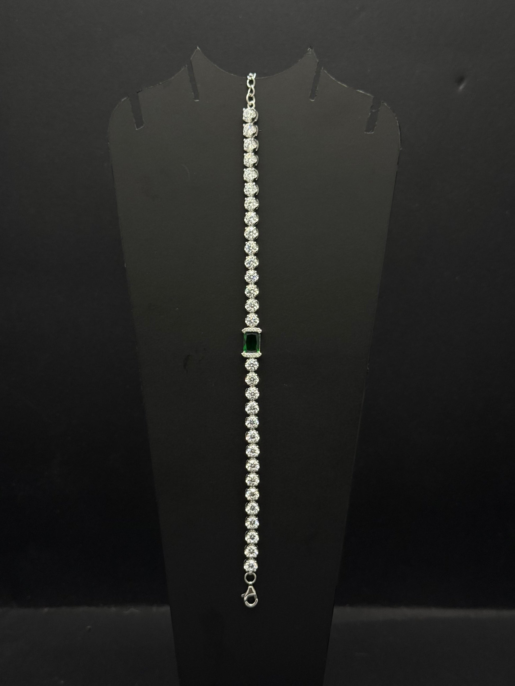 The bracelet is secured with a classic lobster clasp, visible at the bottom, suggesting both durability and ease of wear. The overall design blends classic sophistication with a touch of vibrant color, making it a versatile accessory that could complement various outfits.