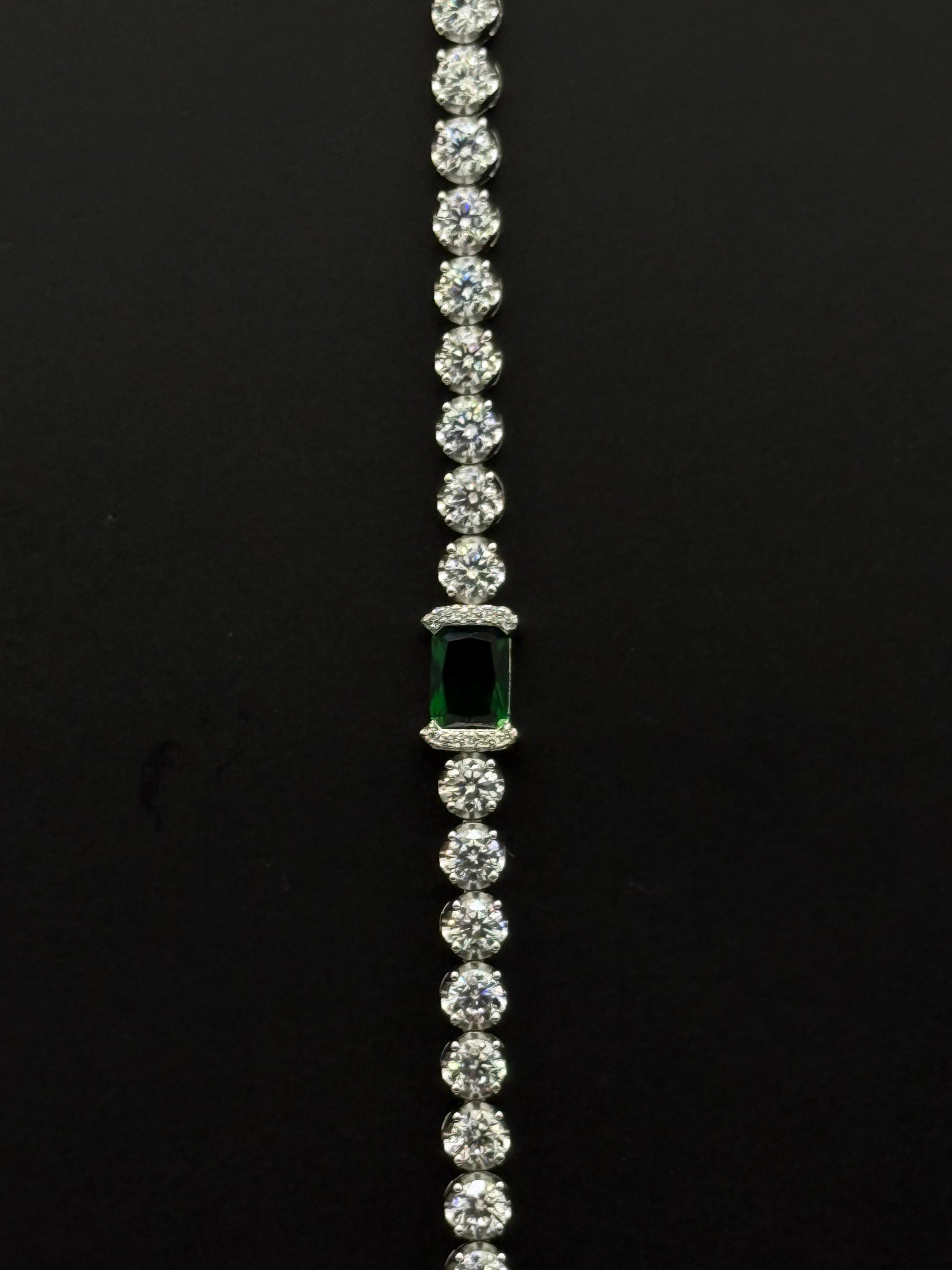 elegant piece, likely a bracelet, is showcased on a black display stand against a subtly textured dark background. It features a continuous line of clear, round-cut stones, each individually set and reflecting light beautifully, creating a sparkling effect.