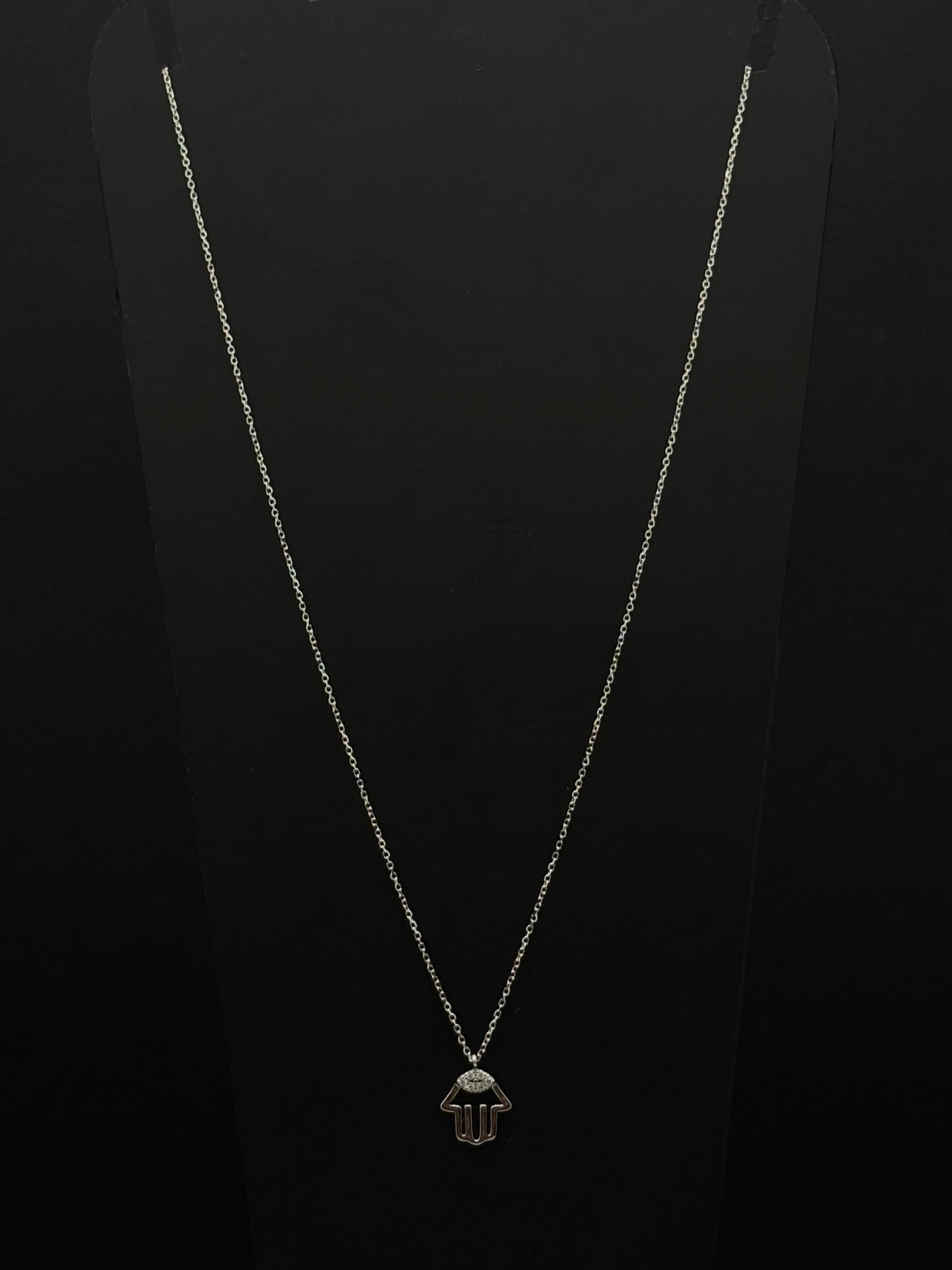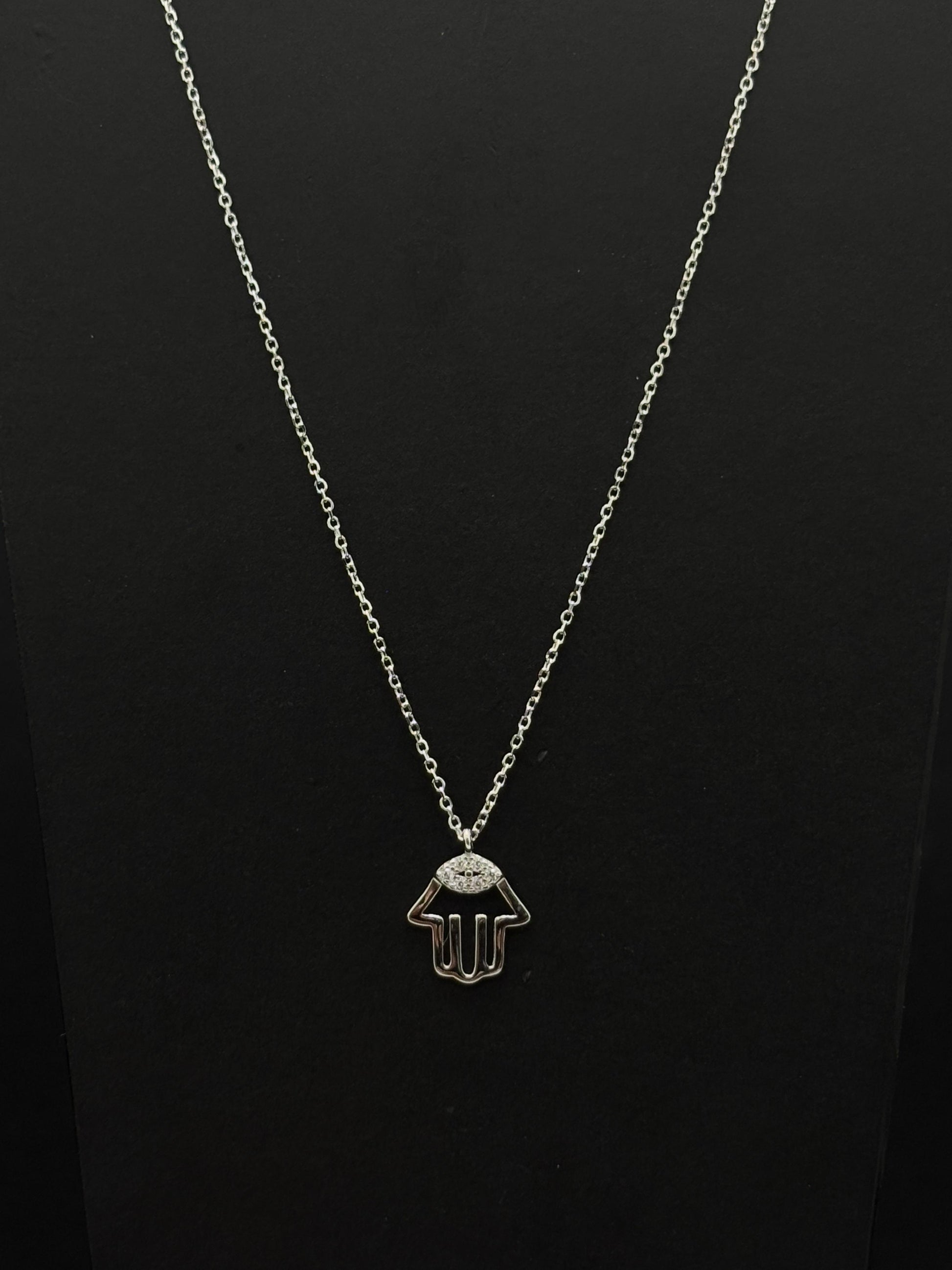This is a delicate silver-colored necklace featuring a pendant that combines two powerful and ancient symbols: the Hamsa hand and the Evil Eye.