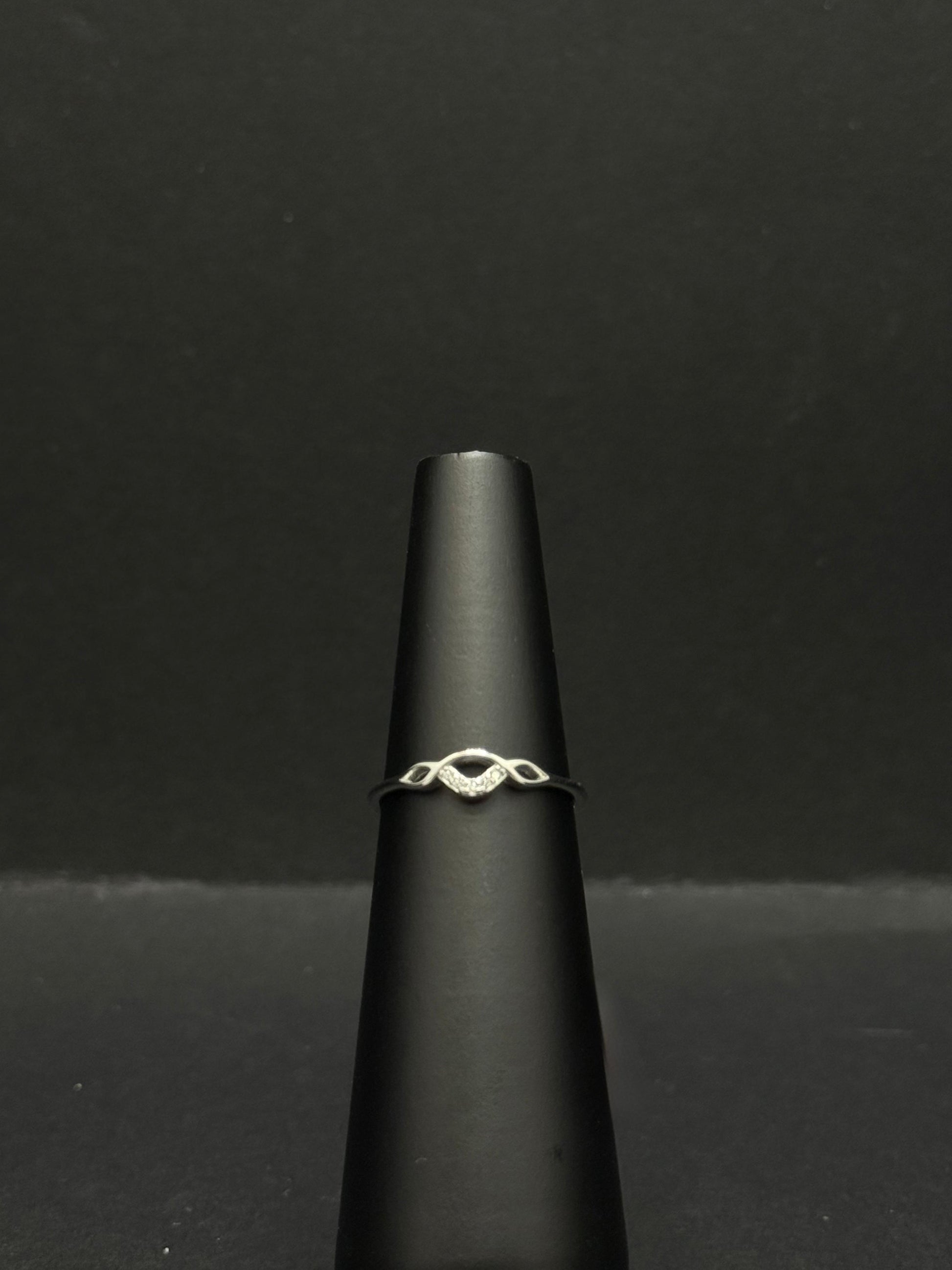 women's ring, likely crafted from sterling silver. The design showcases a central infinity symbol or a stylized figure-eight, which is adorned with micro pave diamonds, adding a subtle sparkle. The band is thin and simple, which draws attention to the intricate centerpiece. The ring is displayed on a black stand against a dark background, making the silver and diamond details stand out. The piece has a romantic and elegant feel, suitable for various occasions