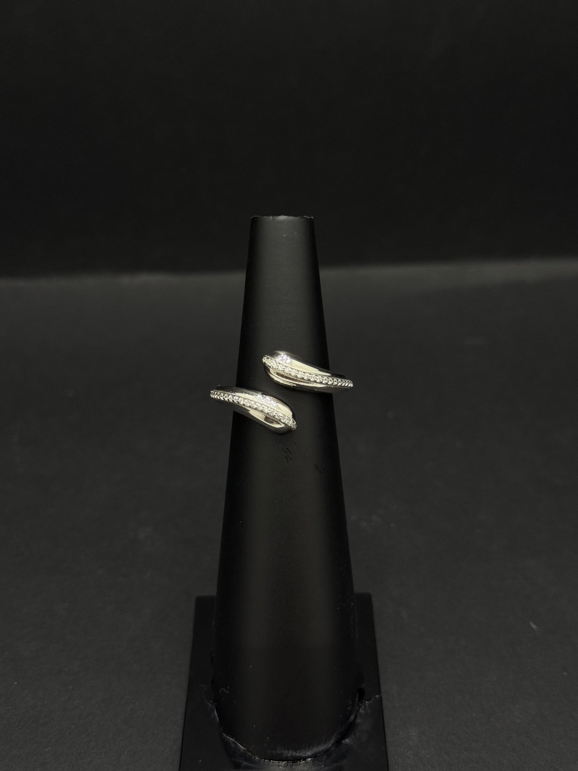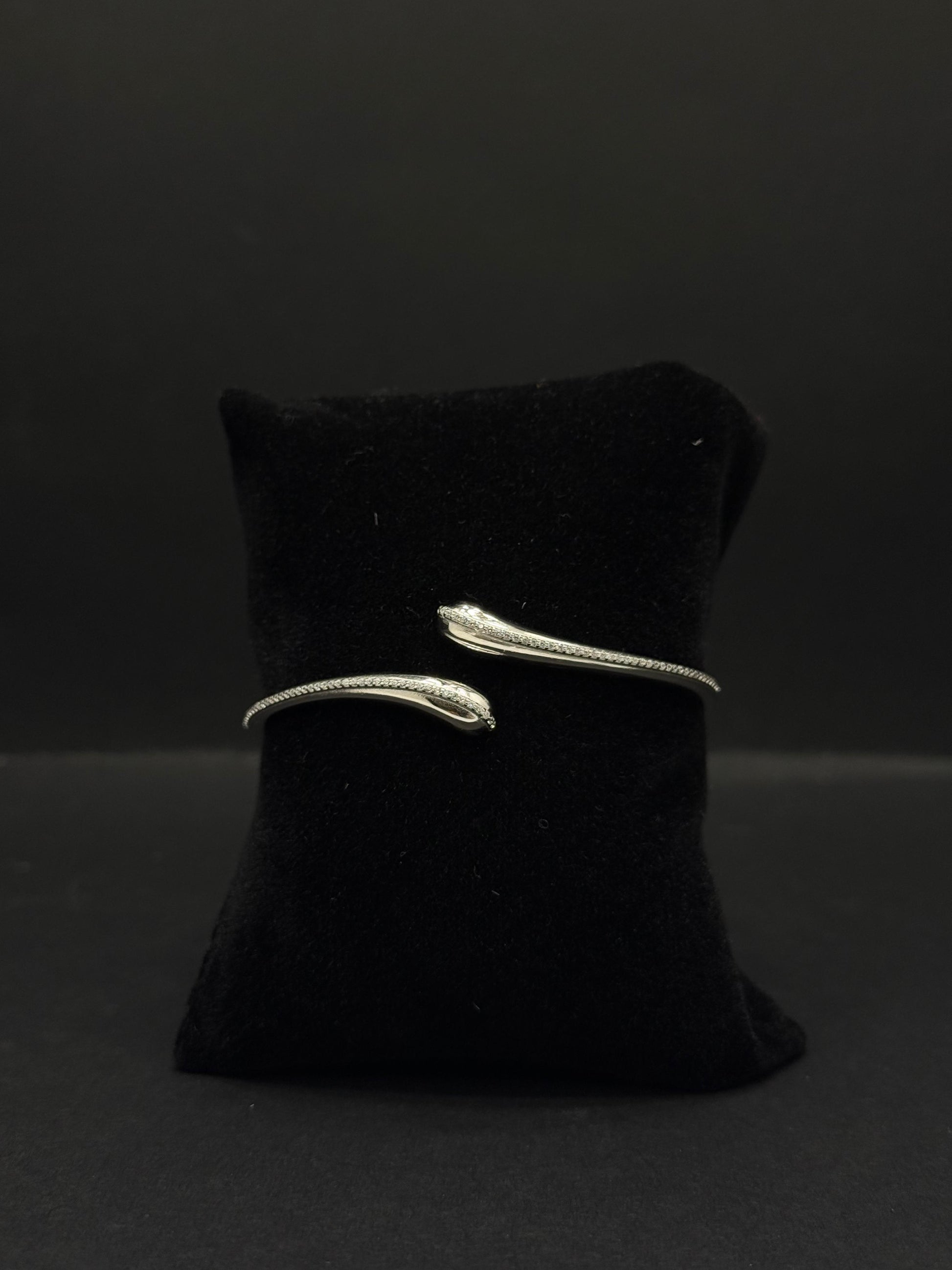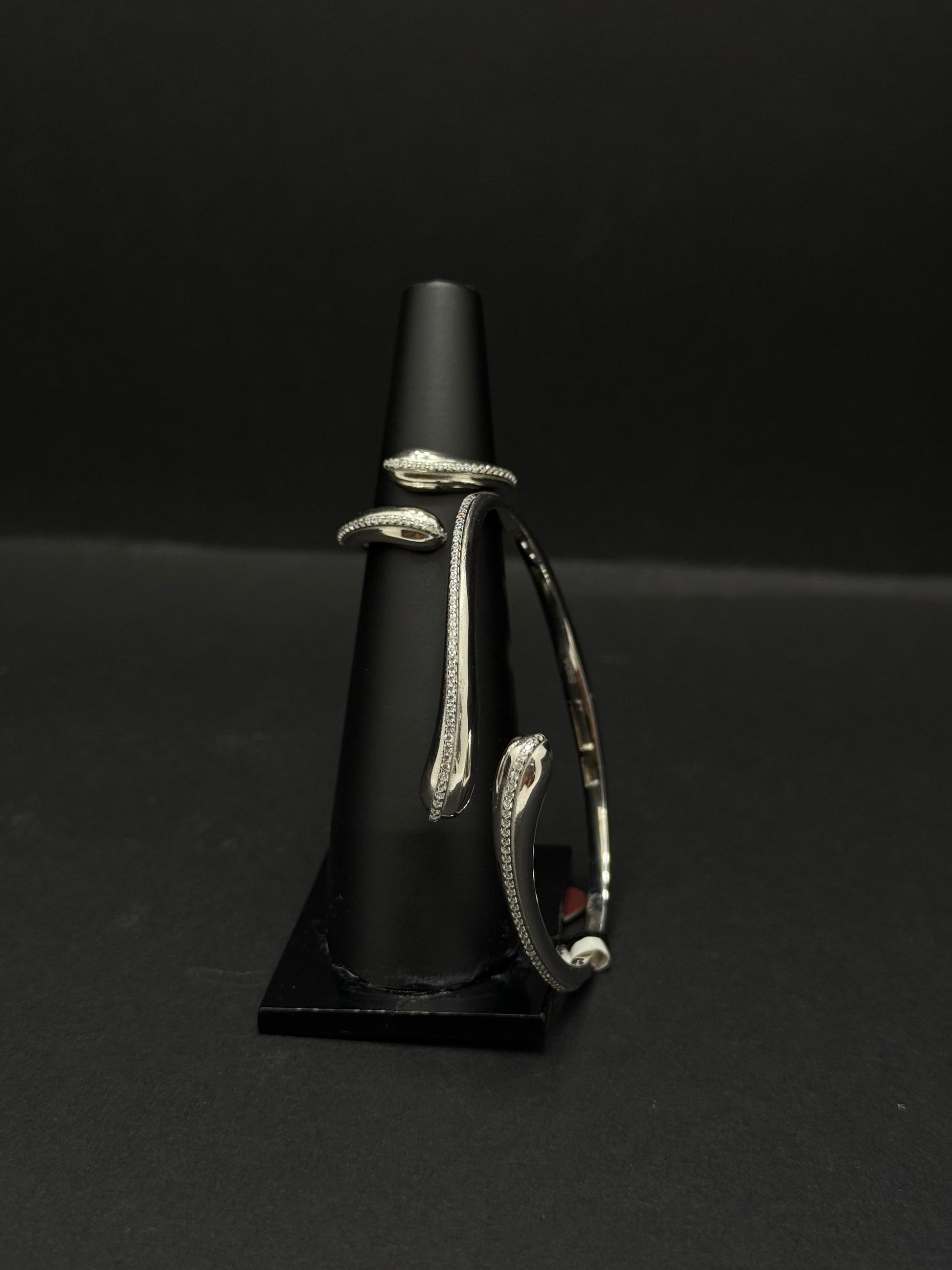 Extending elegantly downwards from this central cluster are two sleek, curved elements, each terminating in a single, larger brilliant-cut clear gemstone. These elements suggest the versatile design of an ear cuff or a multi-part stud earring, designed to gracefully follow and accentuate the contour of the ear. The overall effect is one of sophisticated sparkle, refined grace, and timeless charm. This piece is ideal for adding a touch of unique beauty to any ensemble, perfect for special occasions or to elevate everyday wear.