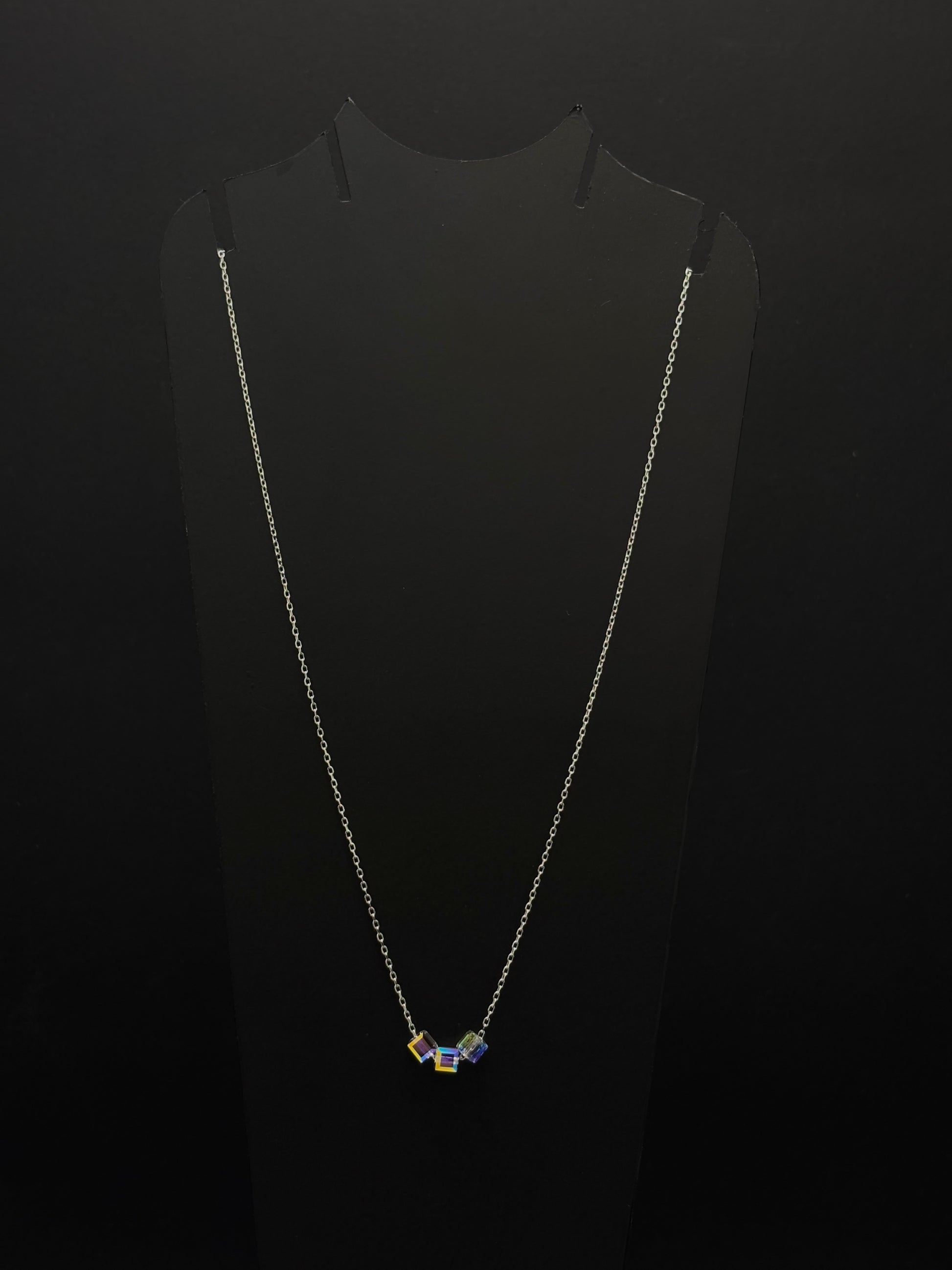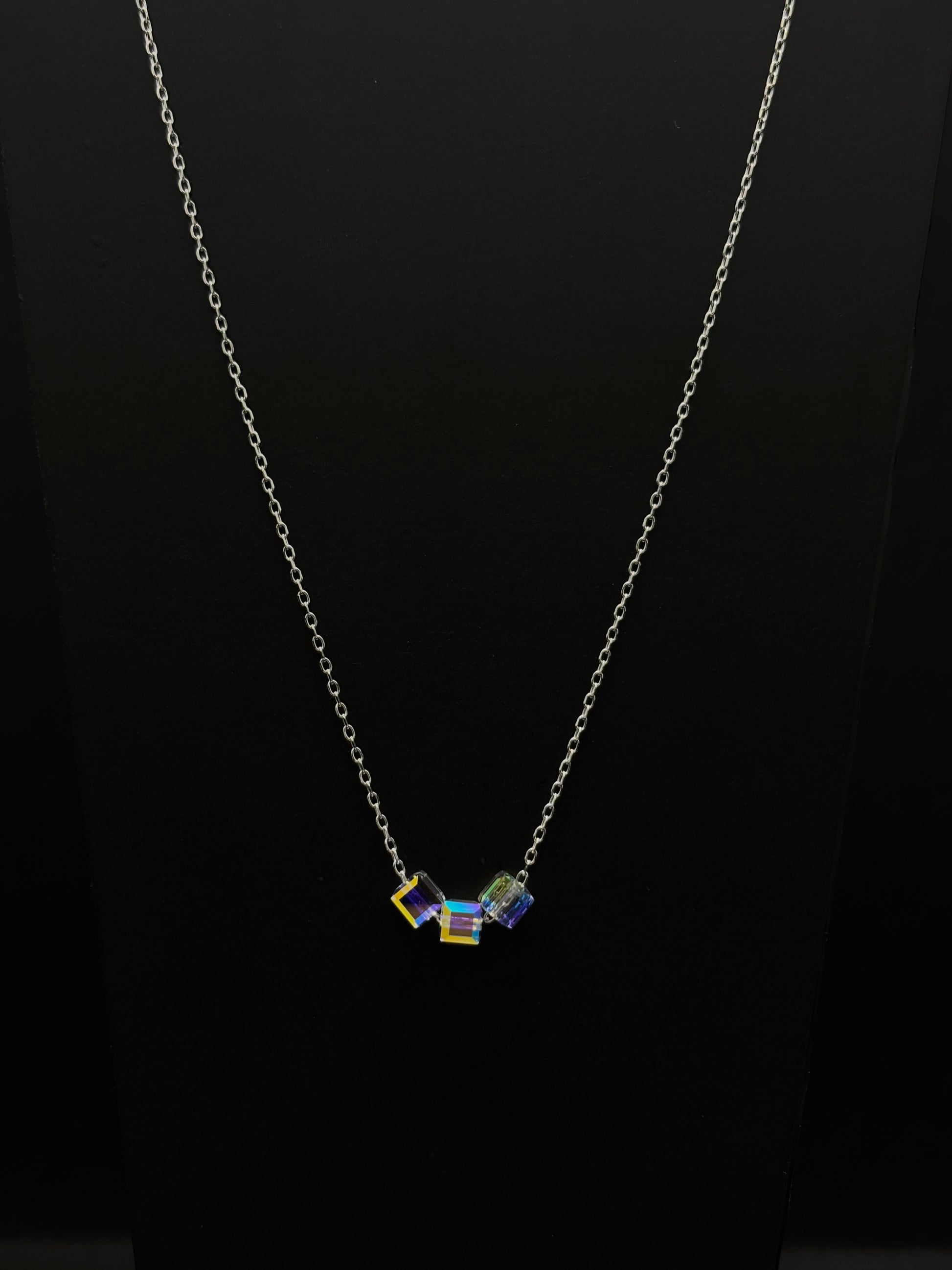 This modern necklace features a delicate silver-toned chain adorned with three mesmerizing square-cut crystal beads. Each bead boasts an iridescent finish, reflecting a subtle spectrum of colors that shift beautifully with the light, adding a touch of understated sparkle. The crystals are strategically spaced along the bottom of the chain, creating a contemporary and effortlessly stylish look. Perfect for layering or wearing on its own, this necklace adds a hint of color and shimmer to any casual or sophisticated outfit, making it a versatile accessory for everyday wear.