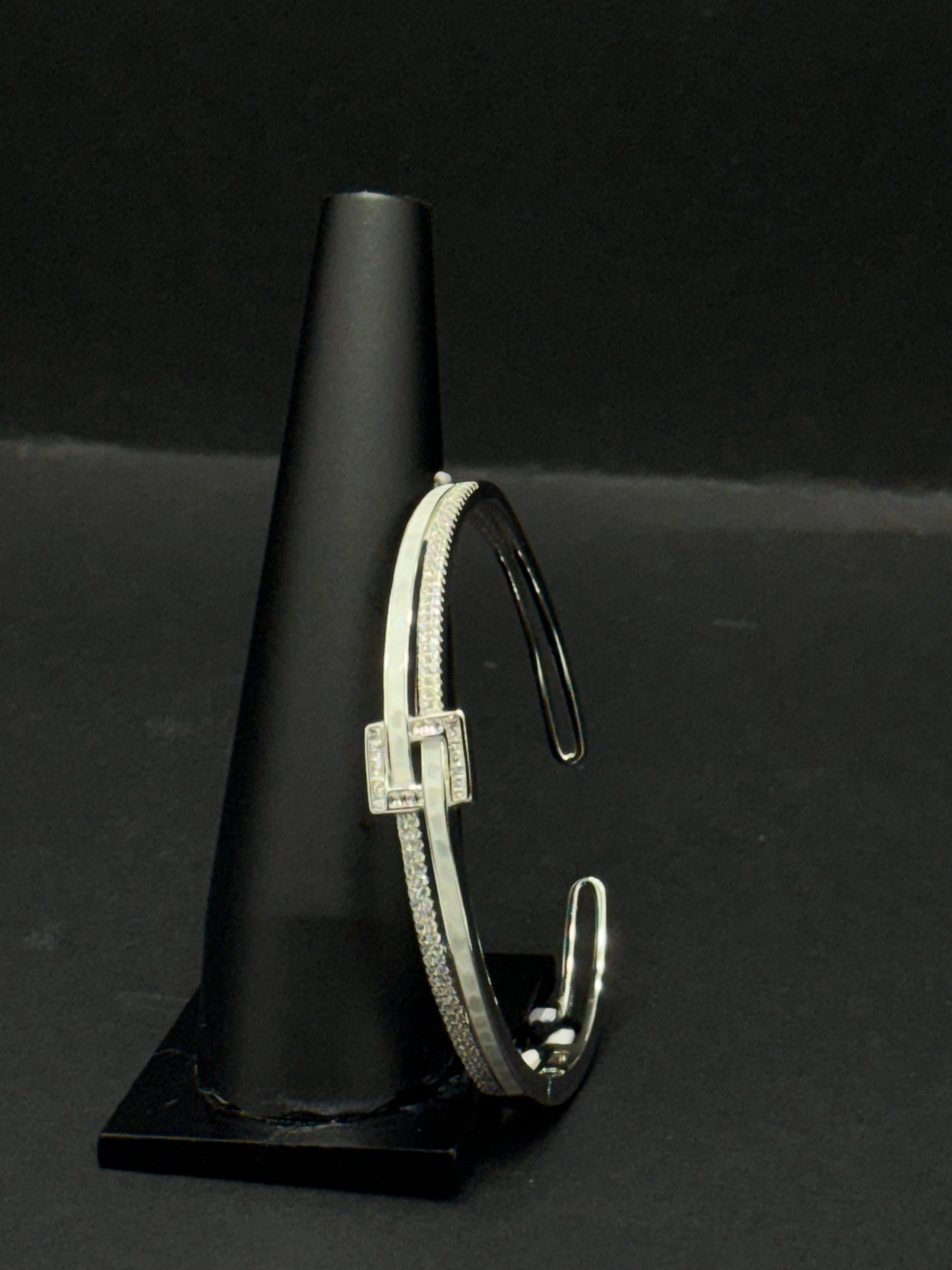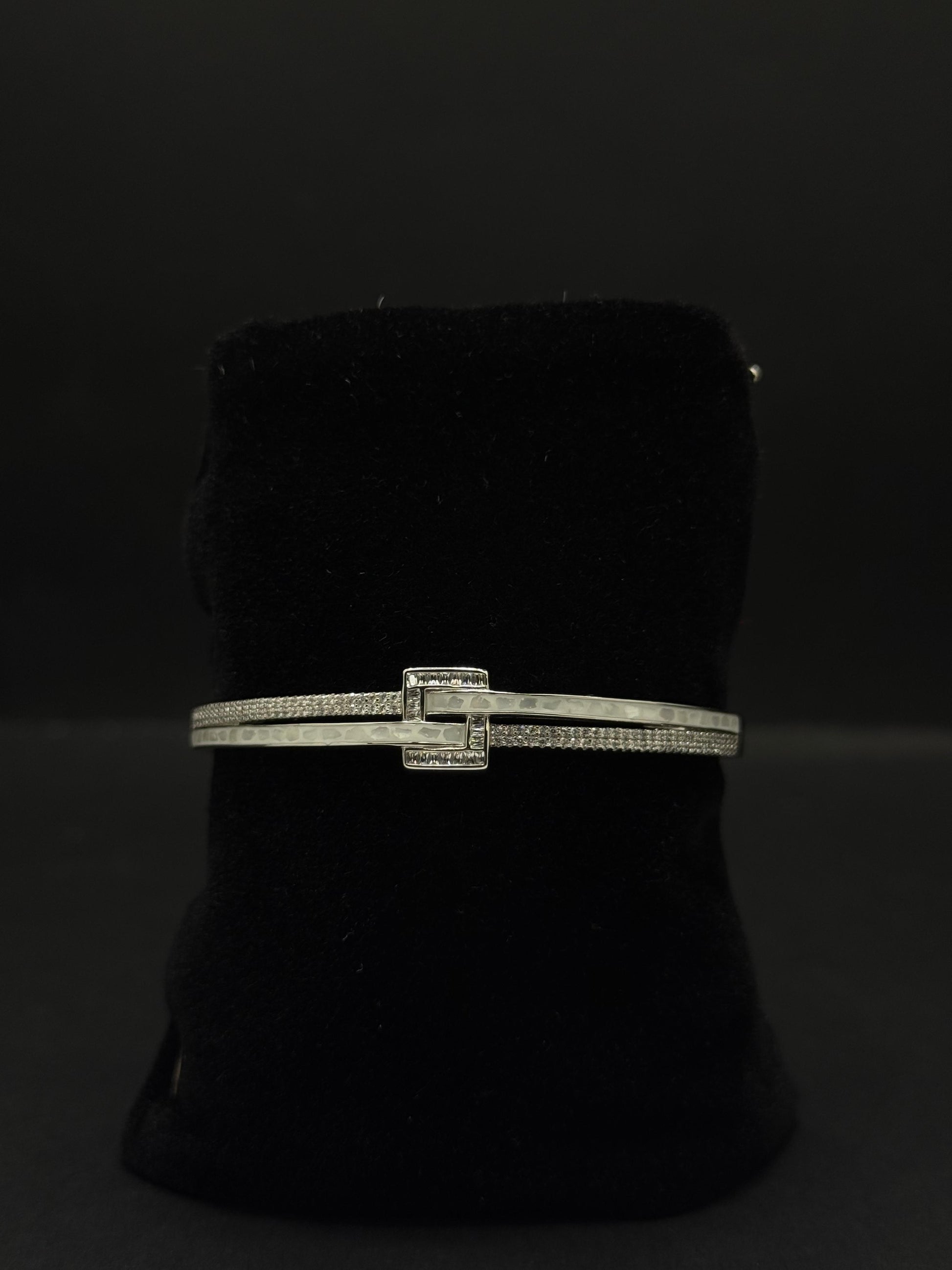 This sophisticated and modern bangle bracelet features a unique design that mimics a double-banded cuff, elegantly connected by a stylish central element. Crafted from a polished metal, likely white gold or sterling silver, its sleek lines exude contemporary charm.The bracelet consists of two distinct, parallel bands that appear to be integrated into a single, cohesive piece. The lower band, and potentially portions of the upper band, are adorned with a dazzling array of meticulously pavé-set clear gemstones, likely diamonds or cubic zirconia. These small, brilliant stones create a continuous surface of intense sparkle, catching and reflecting light beautifully.