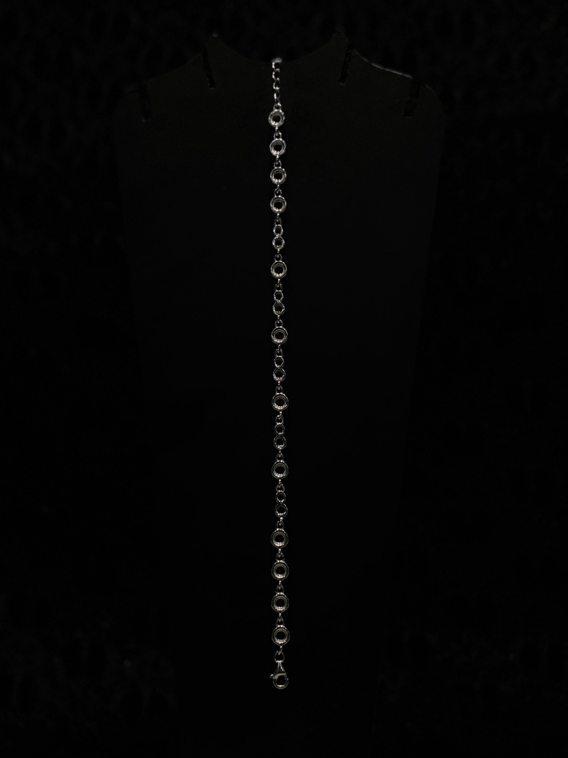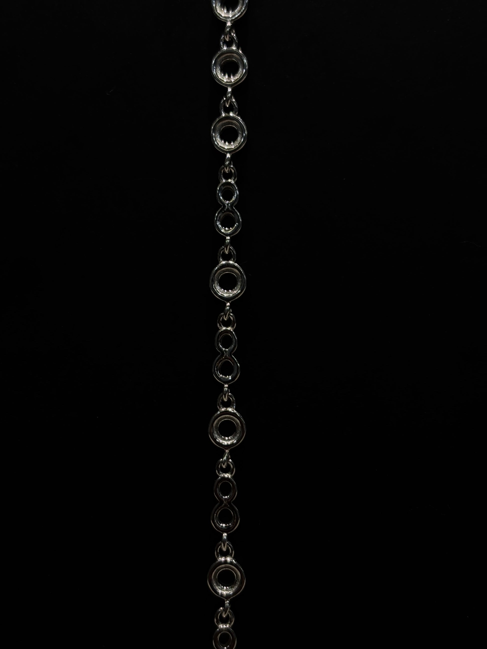 This image showcases a modern and elegant piece of jewelry, likely a necklace or a long bracelet, crafted from a lustrous dark-toned metal, possibly gunmetal, black rhodium-plated sterling silver, or an oxidized finish, giving it a sophisticated and slightly edgy appeal.The design features a continuous chain composed of various sized circular links. The links are primarily open circles, with some appearing to be simple polished rings and others possibly featuring subtle texture or smaller embedded details, though these are less discernible in the image.