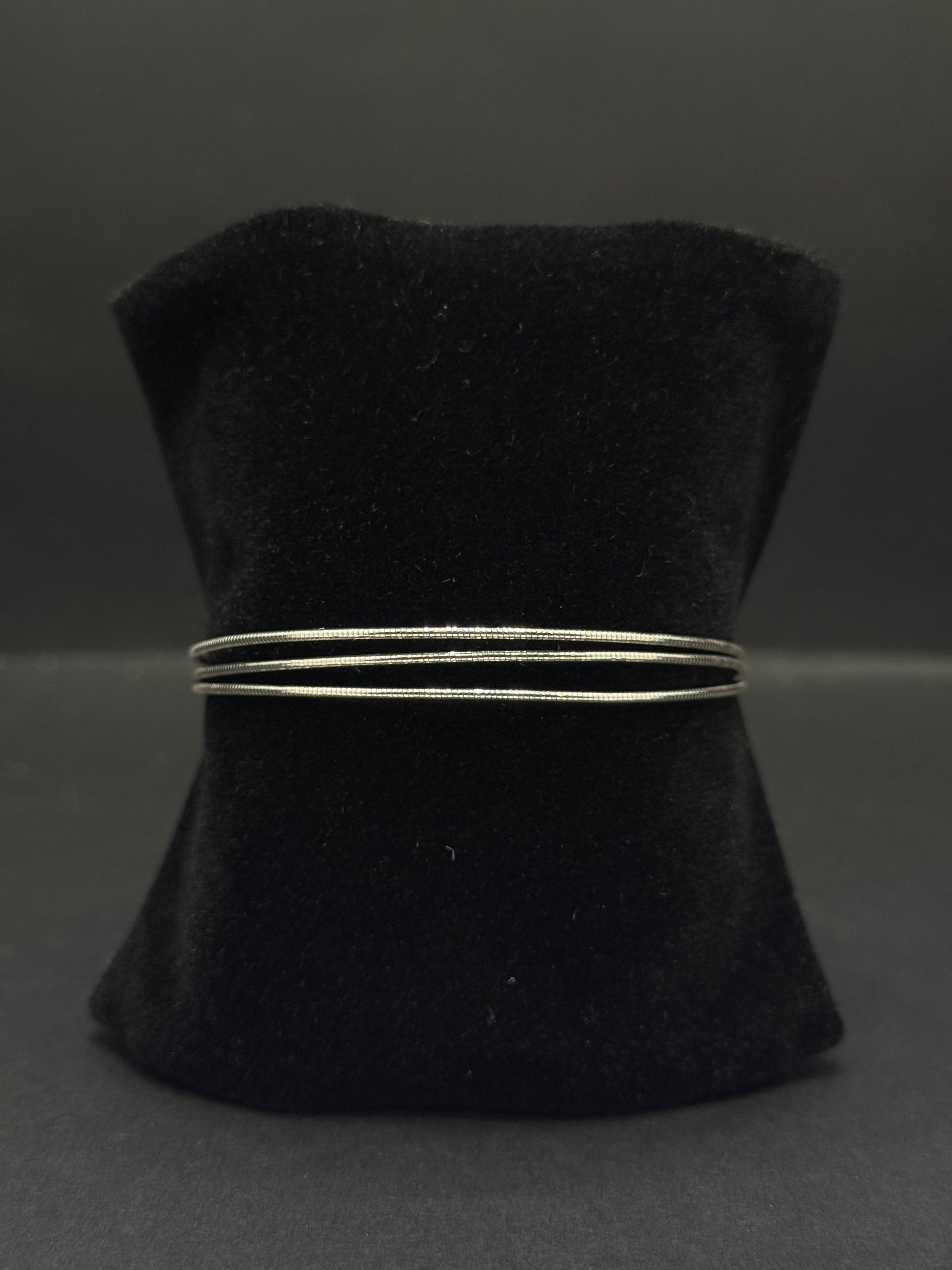 This elegant bracelet features a minimalist yet sophisticated design, crafted from a lustrous silver-toned metal, likely sterling silver or a rhodium-plated alloy, for a brilliant and sleek finish. The bracelet is composed of multiple fine, delicate strands that are subtly twisted or coiled together, creating a layered and fluid effect. These strands lie closely parallel to each other, giving the illusion of a solid yet flexible band. The highly polished surface of the metal allows it to catch and reflect light beautifully, creating a subtle shimmer. The simplicity of the design makes it incredibly versatile, suitable for everyday wear or for layering with other bracelets to create a stacked look.