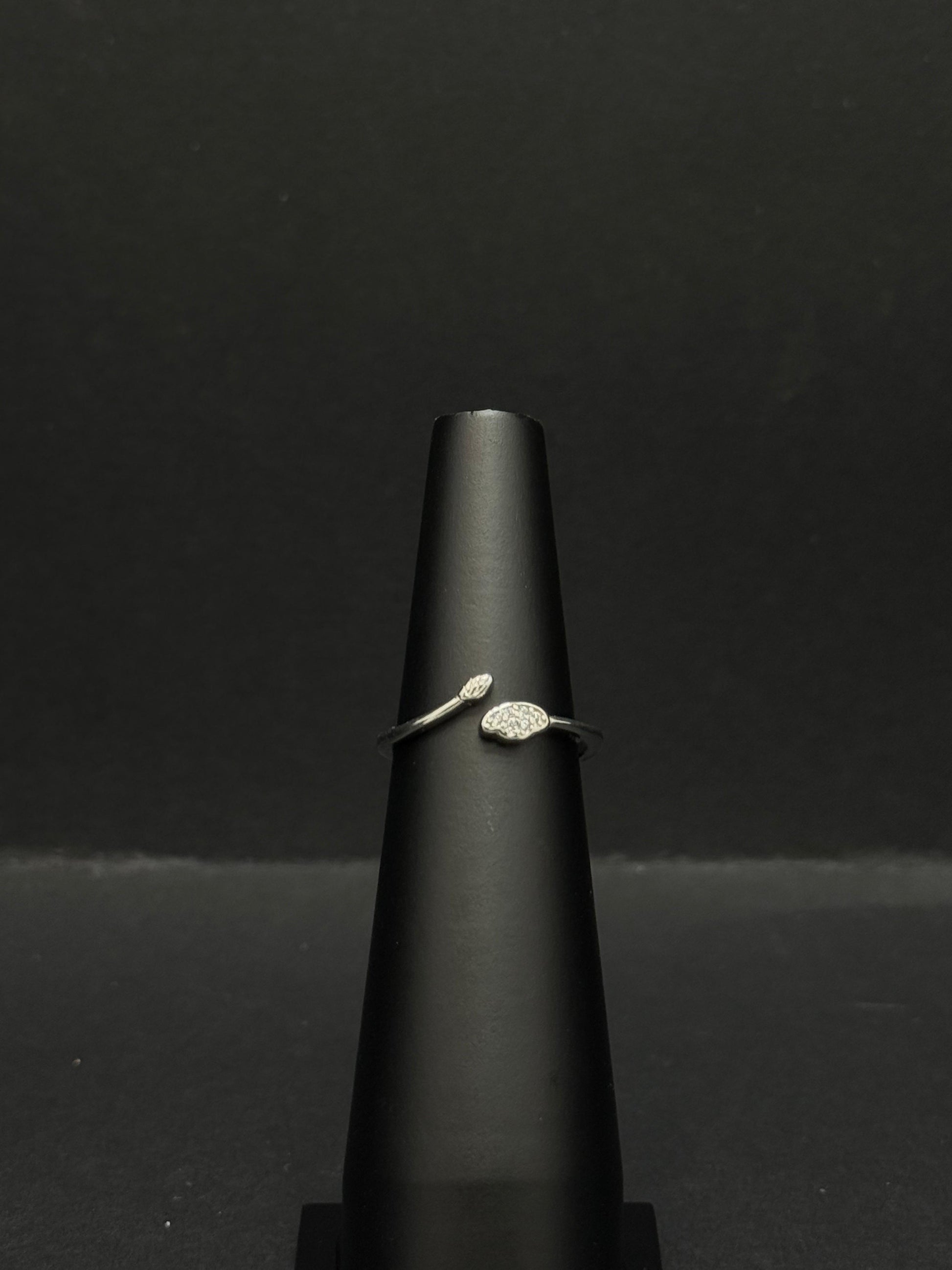 women's ring, likely made of sterling silver. The ring features an open-end design, with the two ends of the band terminating in two different motifs. One end has a delicate leaf shape, while the other features a rounded, oval-like shape. Both of these motifs are adorned with small, sparkling diamonds or cubic zirconia stones, adding a touch of brilliance to the piece. The design is minimalist yet sophisticated. The ring is showcased on a black ring stand against a dark background, which highlights its intricate details and polished finish.