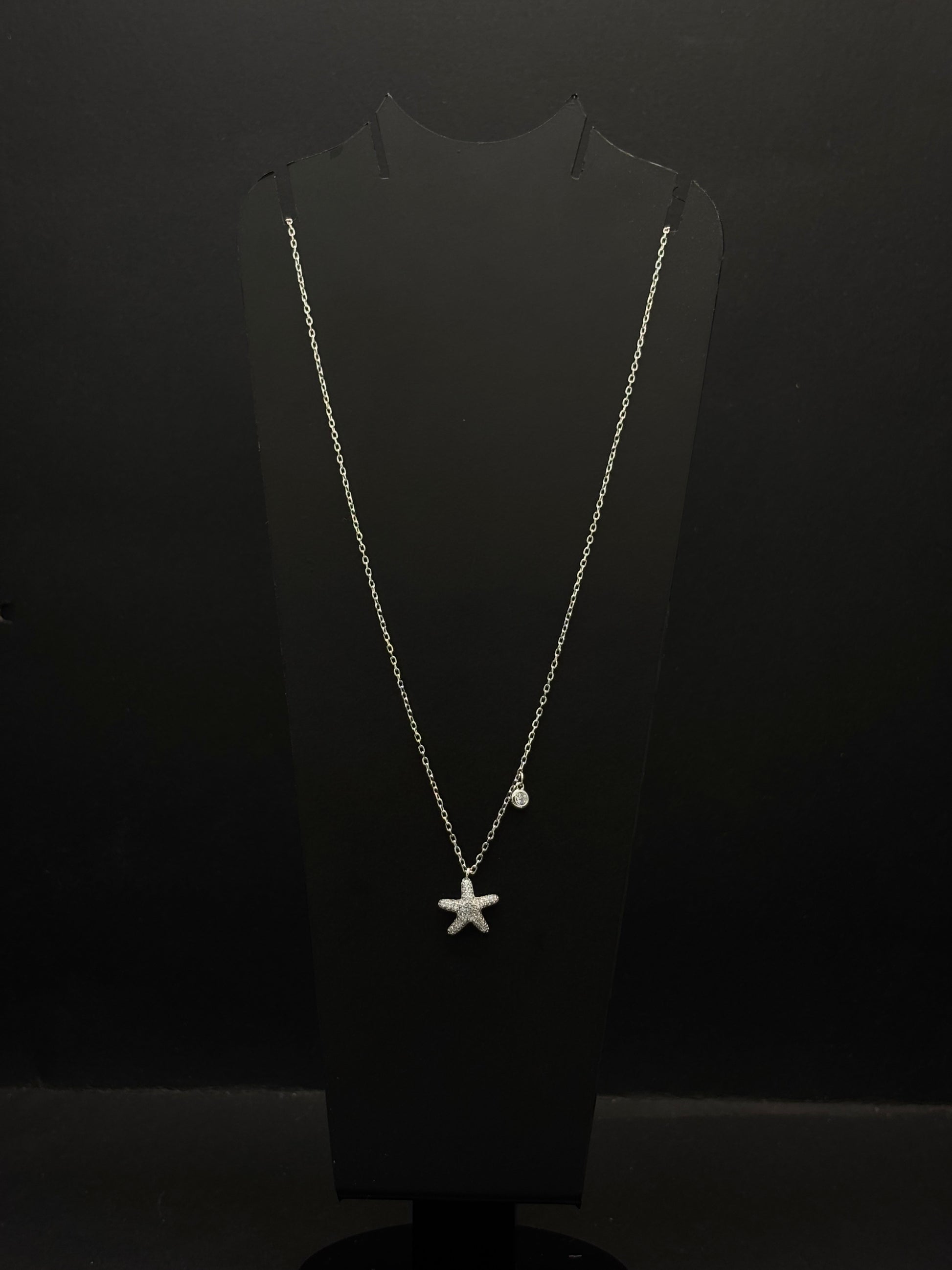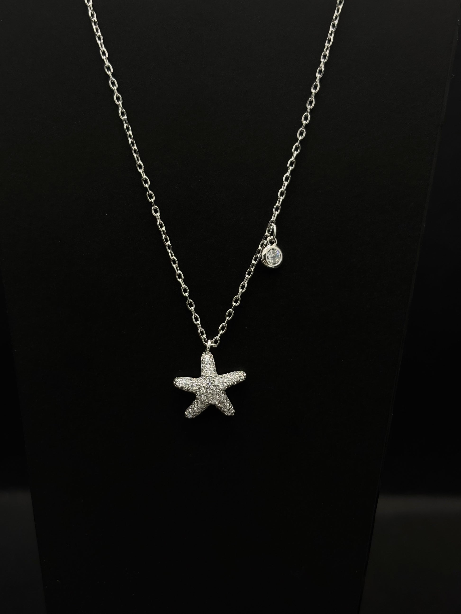 This charming necklace features a bright, silver-toned chain from which hangs a stunning starfish pendant. The starfish is completely covered in a pave setting, with numerous small, sparkling stones that catch the light beautifully. A small, brilliant-cut gemstone is also attached to the chain slightly above the pendant, adding an extra touch of sparkle and unique detail. This piece is perfect for those who love nautical or beach-themed jewelry with a glamorous, eye-catching twist.