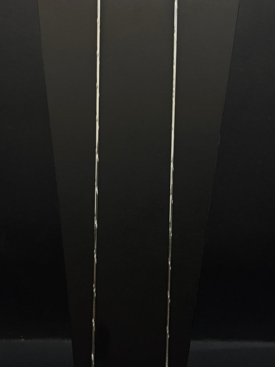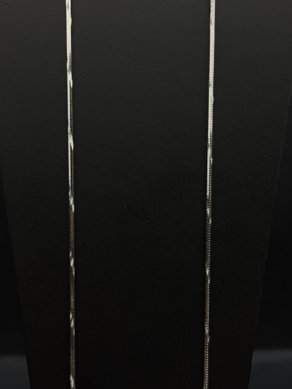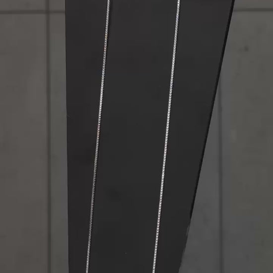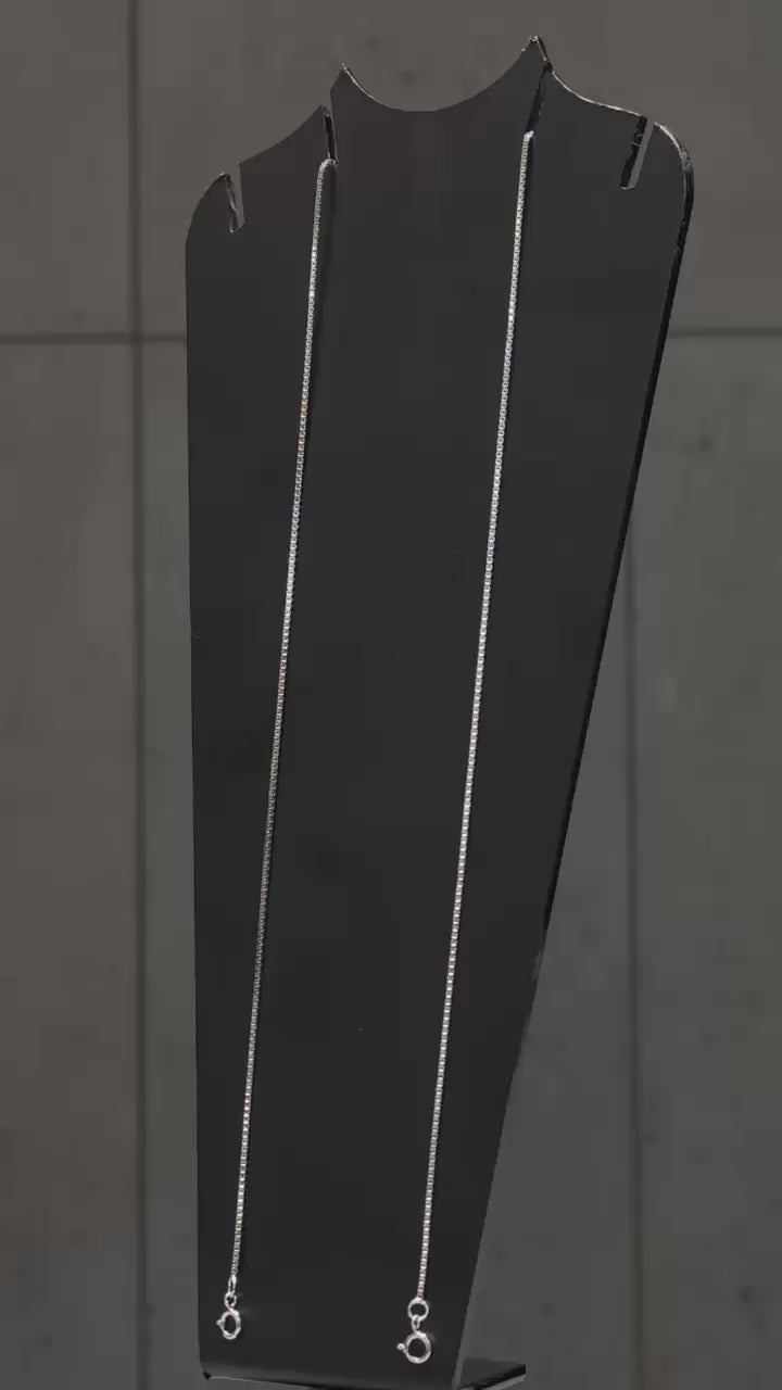 This versatile and essential piece of jewelry is a sleek and minimalist chain, likely intended as a base for pendants or to be worn on its own for a delicate look. It is crafted from a gleaming silver-toned metal, presumably rhodium-plated sterling silver or a similar high-quality alloy, for a brilliant shine and enhanced durability.The chain features a very fine and tightly woven link pattern, characteristic of a snake chain or a box chain. This type of construction gives the chain a smooth, almost fluid feel, and a continuous, reflective surface that subtly catches the light. Unlike chains with individual discernible links, a snake chain presents a uniform, continuous line, offering a sophisticated and contemporary aesthetic.