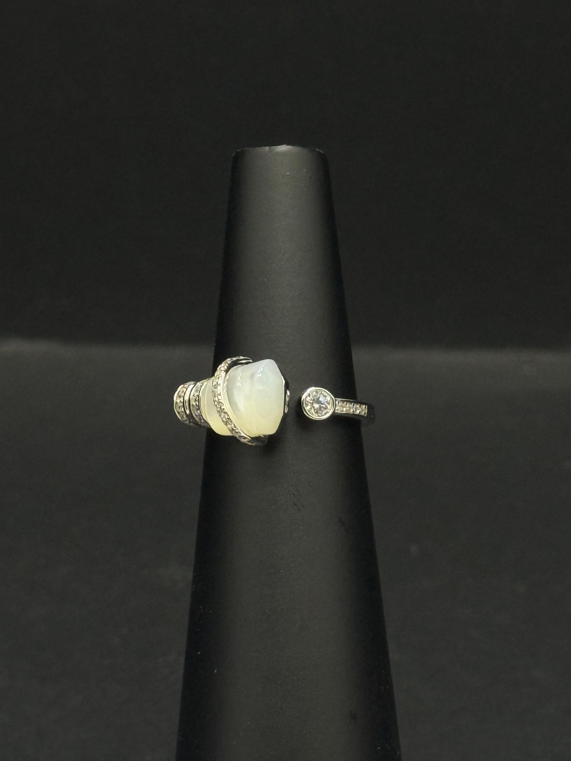 Clustered artfully around the pearl are several sparkling clear gemstones, likely diamonds or high-quality cubic zirconia, cut in various shapes such as marquise, pear, or brilliant round. These smaller stones are meticulously arranged to resemble delicate petals or leaves, creating a floral-inspired motif that beautifully frames the pearl and enhances its natural luster.