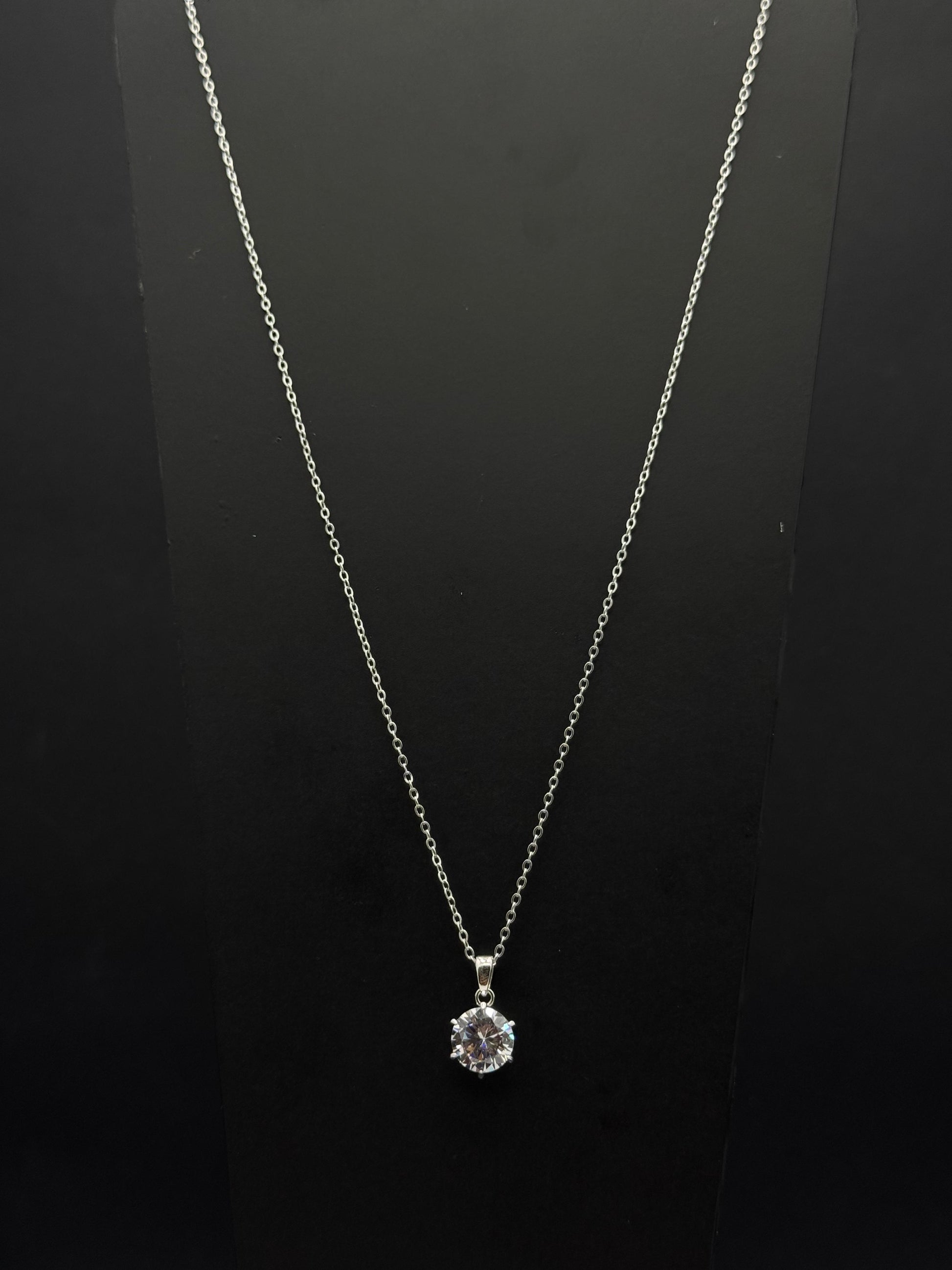 This elegant and sophisticated necklace features a brilliant round-cut cubic zirconia stone, beautifully encircled by a halo of smaller, shimmering stones. The pendant is suspended from a delicate sterling silver chain, which is enhanced by lustrous freshwater pearls and small, dark beads placed at intervals along the length. This piece is a perfect blend of classic and modern, making it an ideal accessory for both formal occasions and adding a touch of glamour to your daily look