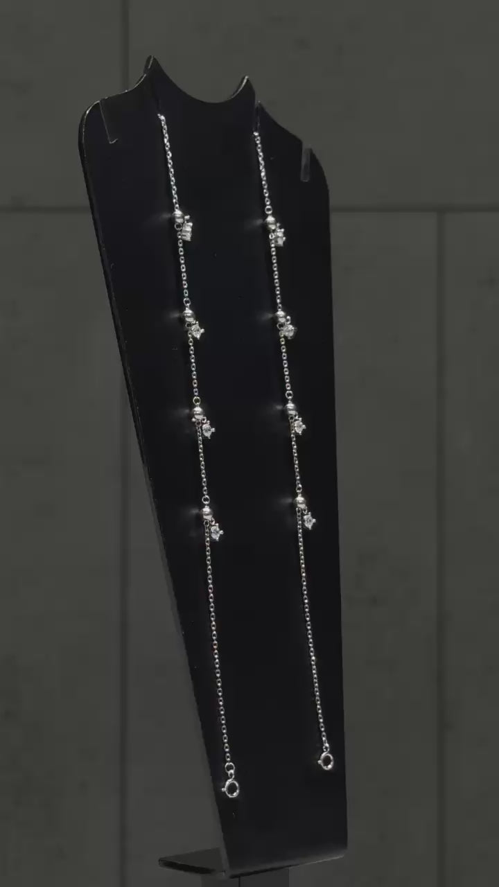 This exquisite pair of long, silver-toned chains presents a delicate and modern design. Each chain features a minimalist construction with evenly spaced small silver beads along its length. Adding a touch of understated glamour, square-cut cubic zirconia stones are intermittently integrated into the chain, either set within a tiny bezel or as small dangling charms, catching the light with subtle brilliance. The overall aesthetic is one of contemporary elegance, making these chains versatile accessories. The presence of a loop or clasp at the ends of each chain suggests they are designed for attachment, potentially as eyewear chains, mask holders, or delicate decorative accents. Their light and airy feel makes them suitable for everyday wear while still offering a refined sparkle.