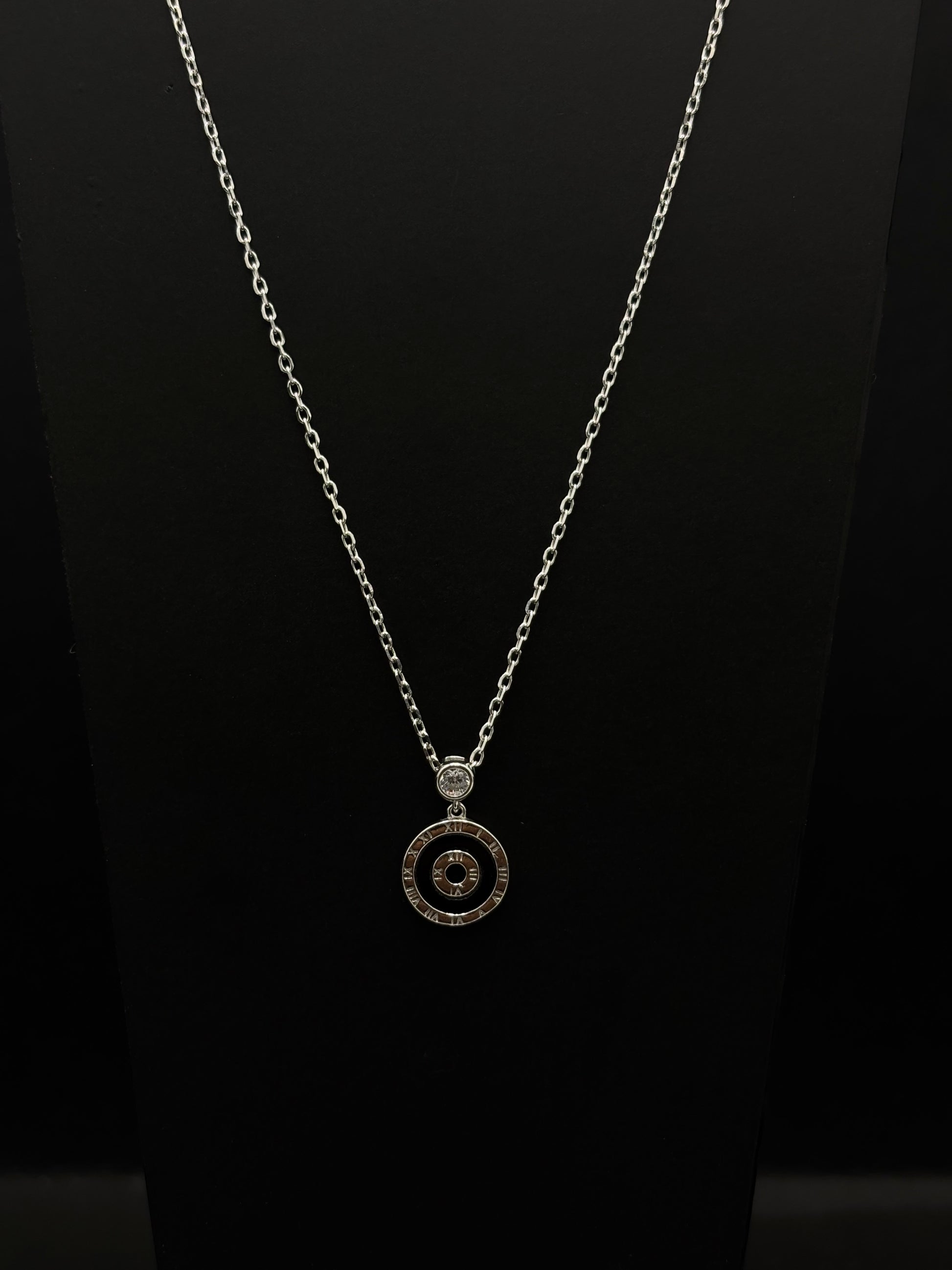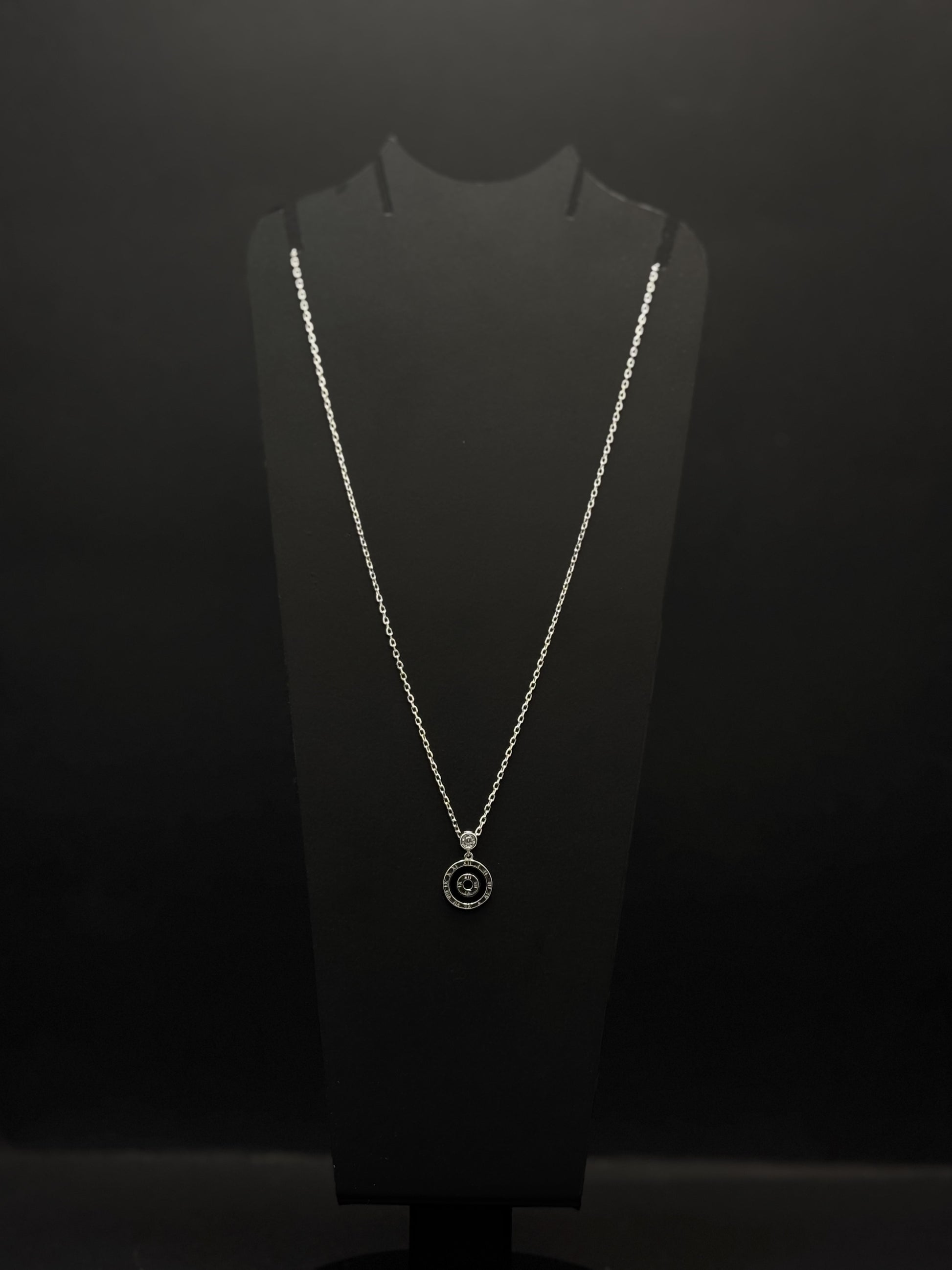 This is a silver-toned necklace featuring a delicate chain. The pendant is a circular, open-work design with a smaller, central element that appears to have some sort of embellishment, possibly a small gem or a patterned detail. The necklace is displayed on a black stand, which provides a strong contrast and highlights the jewelry's design. The overall aesthetic is elegant and subtle, making it suitable for both everyday wear and special occasions