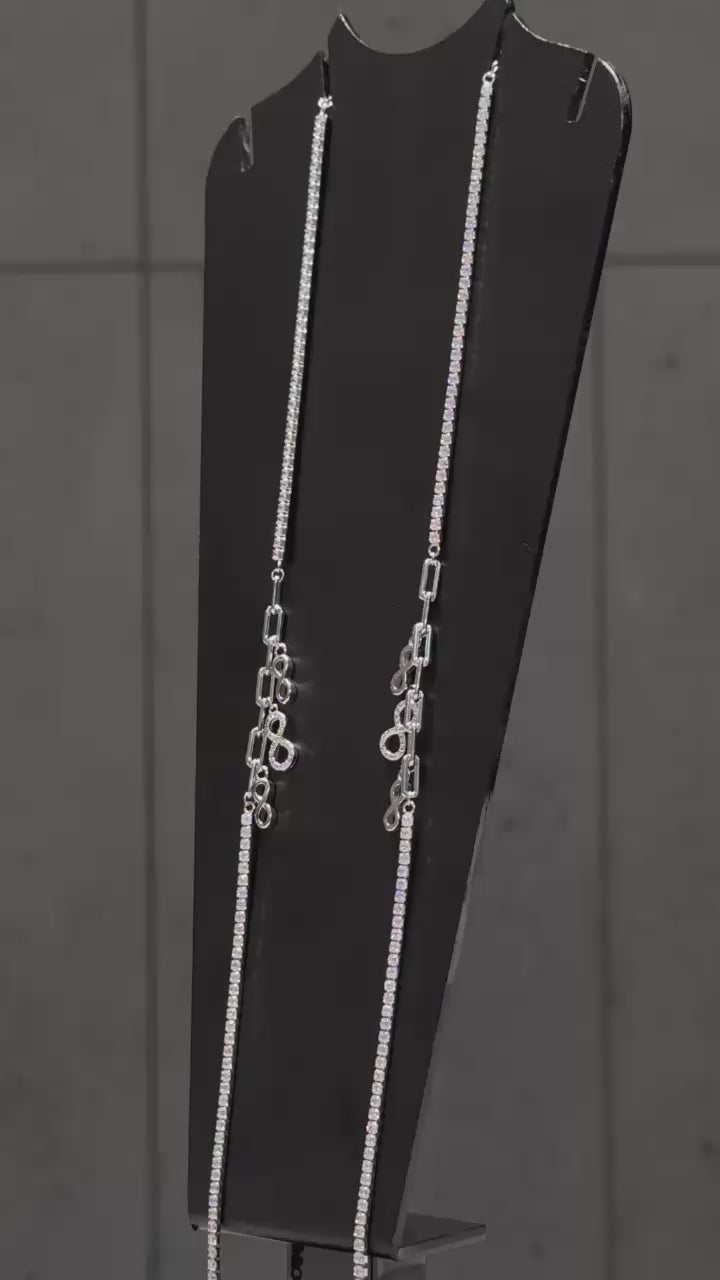 This striking and contemporary piece of jewelry, likely a necklace or a long bracelet, features a sophisticated design crafted from a gleaming silver-toned metal, presumably rhodium-plated for optimal brilliance and durability.The chain is composed of sleek, elongated rectangular links, characteristic of a modern paperclip-style chain, which provides a clean and understated aesthetic.The design is adorned with a series of prominent, sparkling infinity symbol charms. Each infinity symbol is entirely encrusted with numerous small, meticulously pavé-set round brilliant cut cubic zirconia stones, creating a continuous and dazzling sparkle.