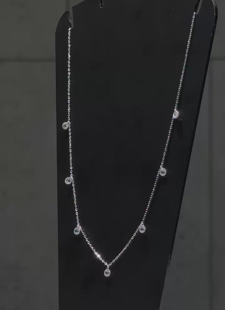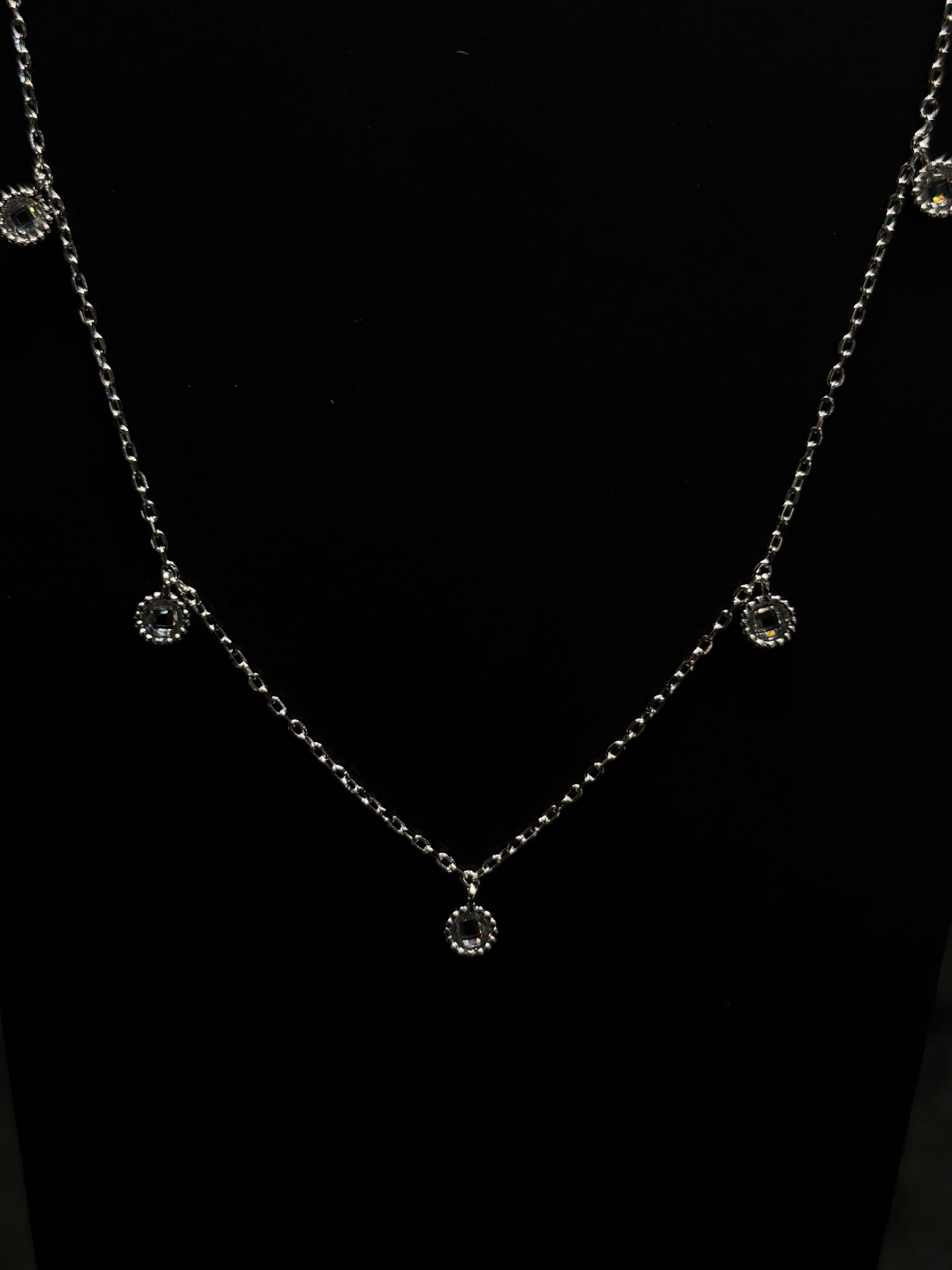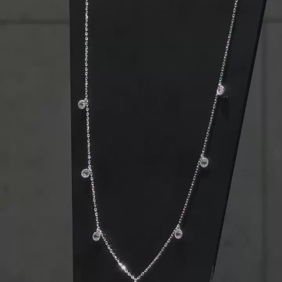 This elegant necklace features a classic "stations" or "diamonds by the yard" style, crafted in a lustrous silver-toned metal. Along its delicate chain, multiple brilliant, round-cut cubic zirconia stones are individually set at regular intervals. Each stone is encircled by a subtly textured or beaded bezel setting, which not only secures the stone but also adds a refined detail and enhances its sparkle by creating a halo effect.