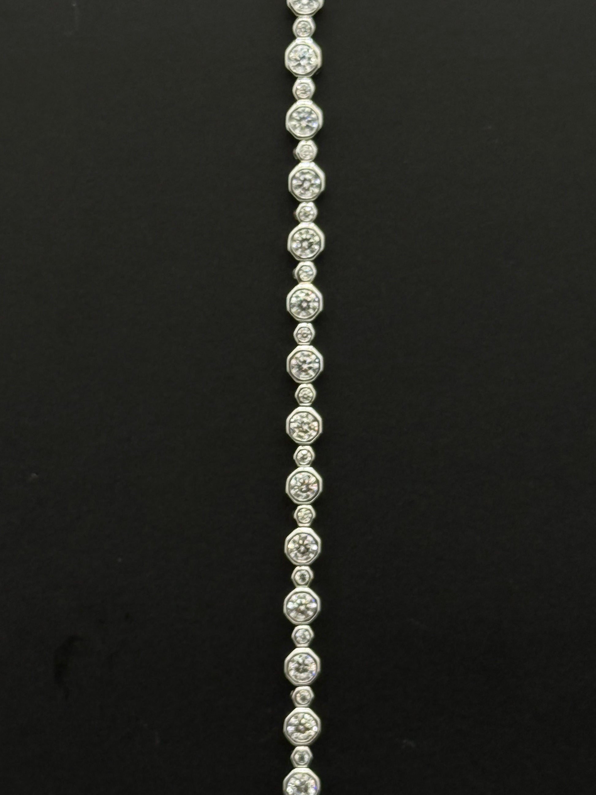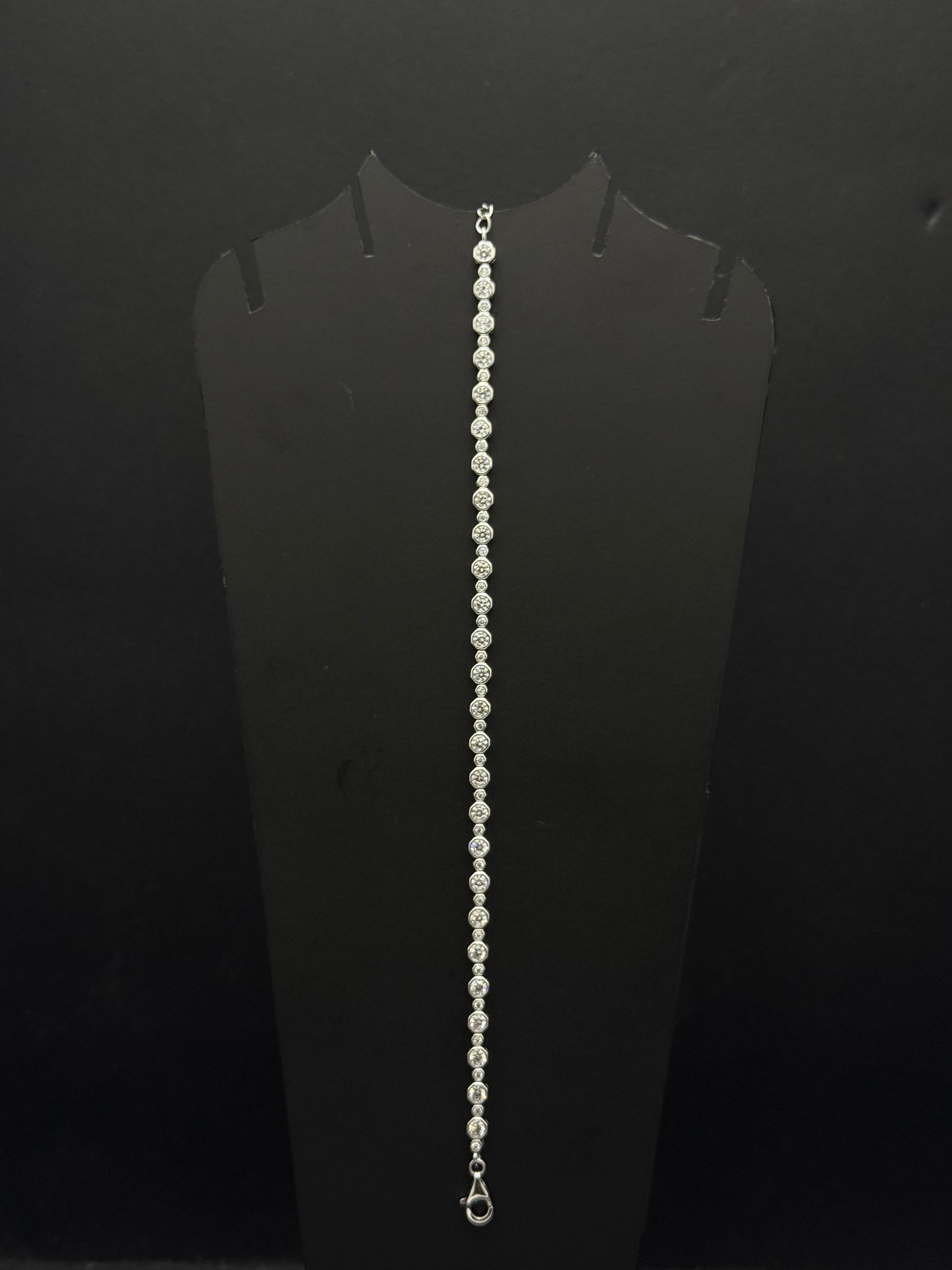 This elegant piece is a long, silver-toned chain featuring a continuous series of individually set, brilliant round cubic zirconia stones. Each stone is securely nestled within a sleek bezel setting, which not only highlights its sparkle but also provides a smooth and snag-free profile. The stones are evenly spaced along a delicate chain, creating a classic "station" design where the embellishments are integrated seamlessly into the length of the chain. The overall impression is one of sophisticated simplicity and continuous sparkle. The chain includes an adjustable clasp mechanism, suggesting versatility for wear as a long necklace, wrapped as a multi-layered bracelet, or as a decorative accessory for various purposes, adding a subtle yet consistent gleam to any look.