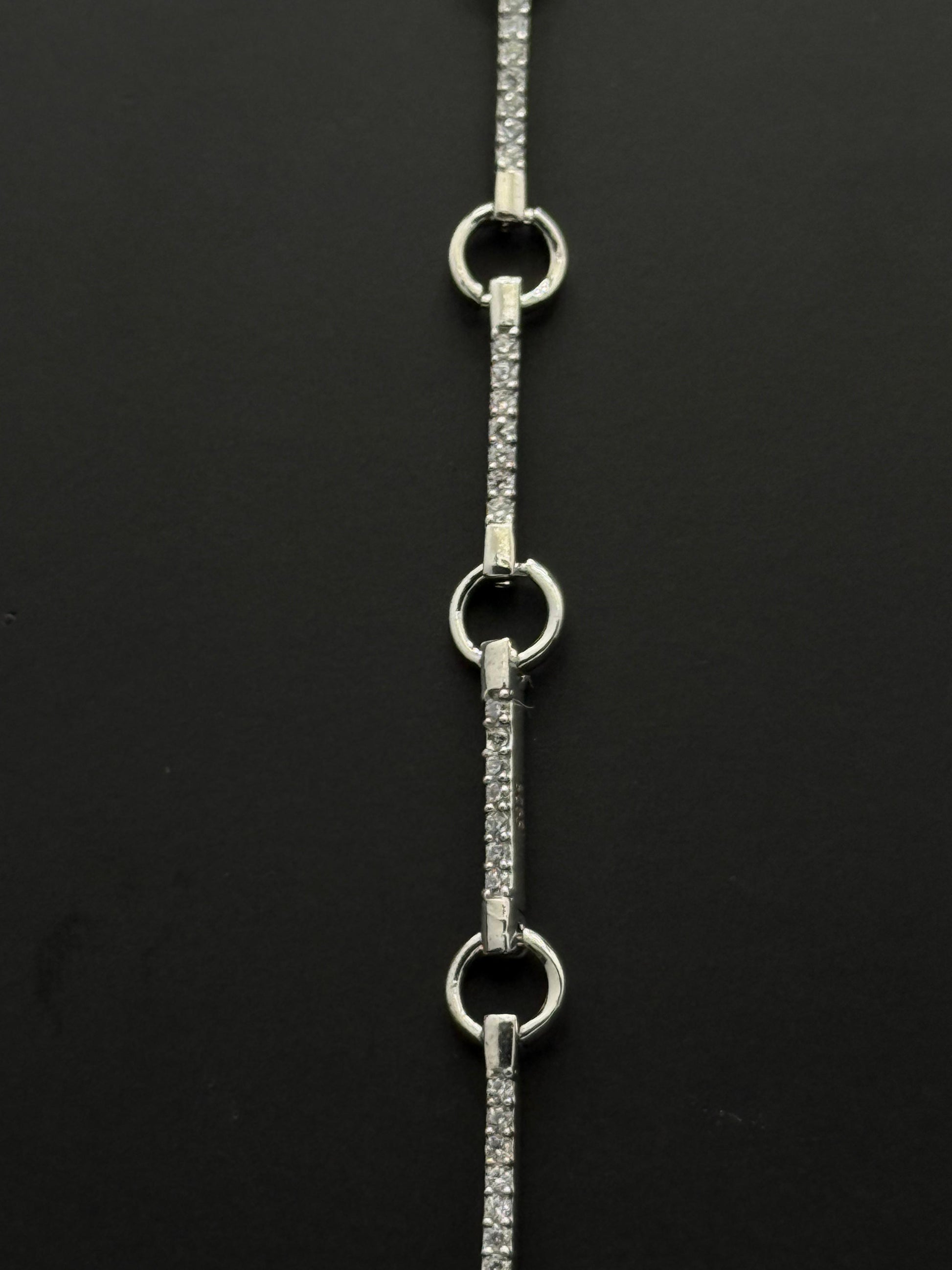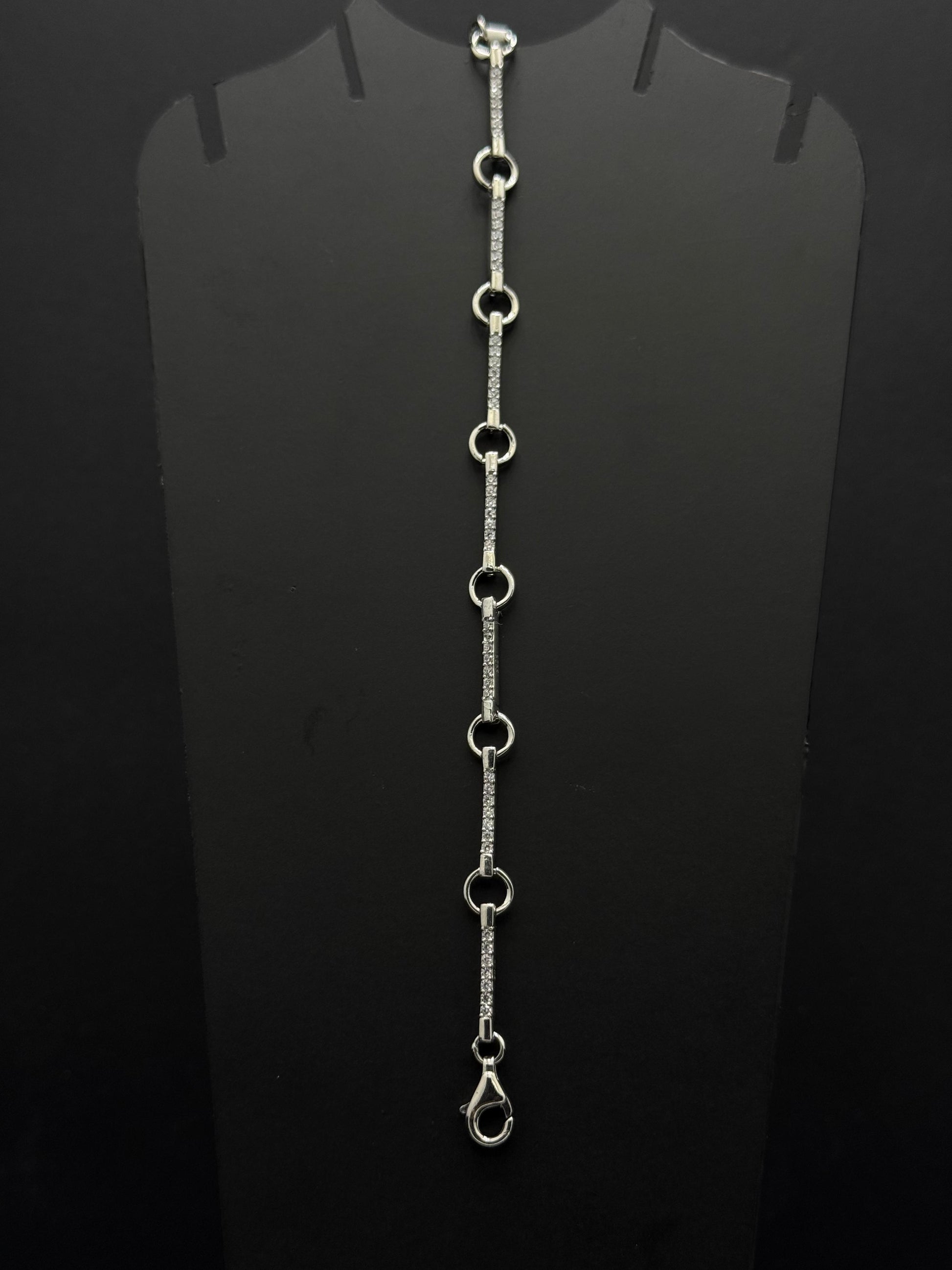 This elegant bracelet features a contemporary station design, crafted from silver-toned metal. Along its length, it alternates between sections of fine, delicate chain and captivating station elements. Each station consists of a small, polished silver-toned ring, which is connected to a segment of chain adorned with tiny, shimmering rhinestones or crystals, giving the appearance of pave setting. This interplay of smooth rings and sparkling segments creates a dynamic and sophisticated visual appeal. The bracelet concludes with a sturdier chain section and a clasp, allowing for adjustable wear. Its design is versatile enough for both everyday wear and for adding a subtle touch of glamour to more formal ensembles.