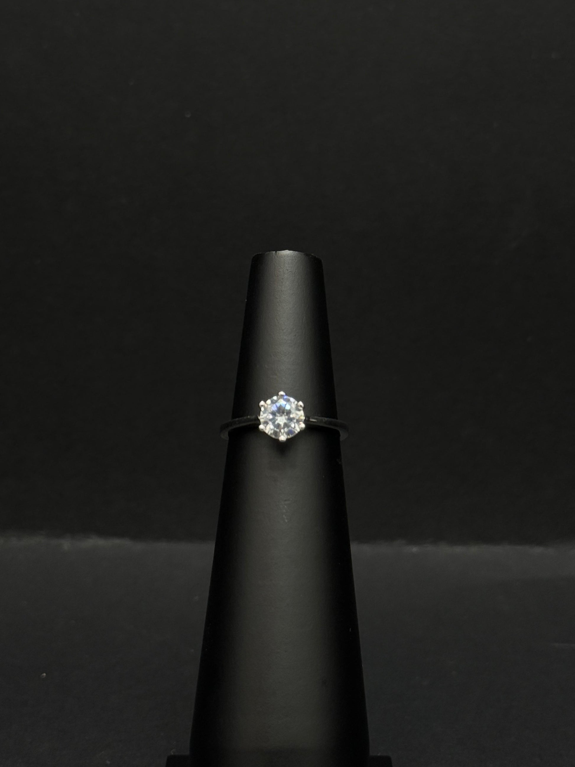 This image features a classic solitaire ring, likely made of sterling silver. The centerpiece is a single, brilliant round-cut stone, which appears to be a cubic zirconia or a lab-created diamond due to its clear sparkle and perfect facets. The stone is held securely by a six-prong setting, which allows for maximum light exposure and brilliance. The band is thin and simple, drawing all the attention to the central stone. The ring is a timeless and elegant piece, perfect for a classic look. It is displayed on a black ring stand against a dark background, which highlights its simple beauty and sparkle.