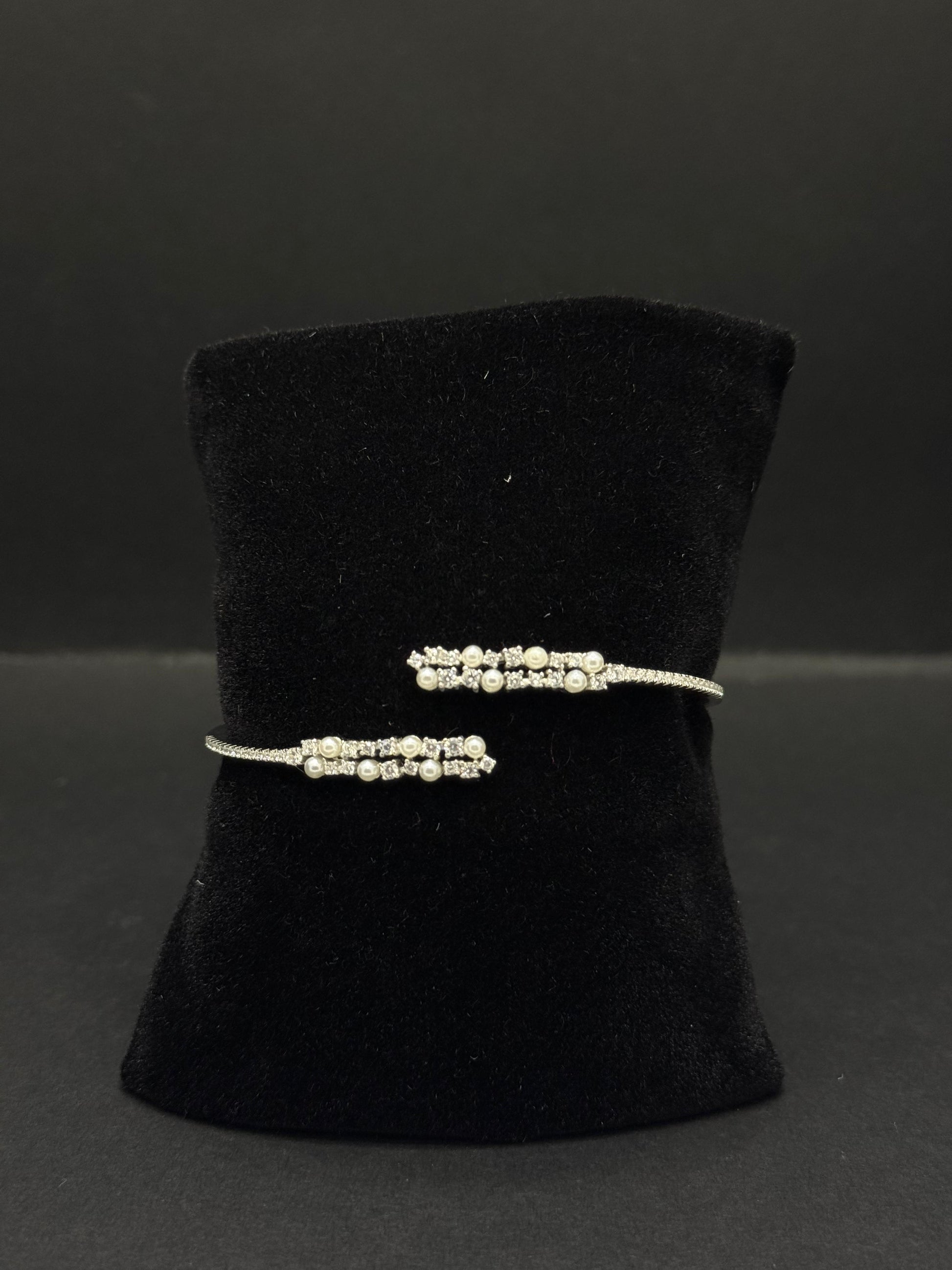 A timeless and elegant piece, this open cuff bangle features a captivating design that gracefully wraps around the wrist. One side is adorned with a delicate vine-like cluster of lustrous pearls and brilliant-cut cubic zirconia (or diamonds, if applicable) that shimmer with every movement. The opposing side mirrors this enchanting arrangement, creating a balanced and sophisticated look. The high-polish, rhodium-plated (or silver/white gold) finish adds a final touch of luxury, making this bracelet perfect for special occasions or to elevate everyday wear. It is a versatile accessory that beautifully complements both formal gowns and chic casual outfits.
