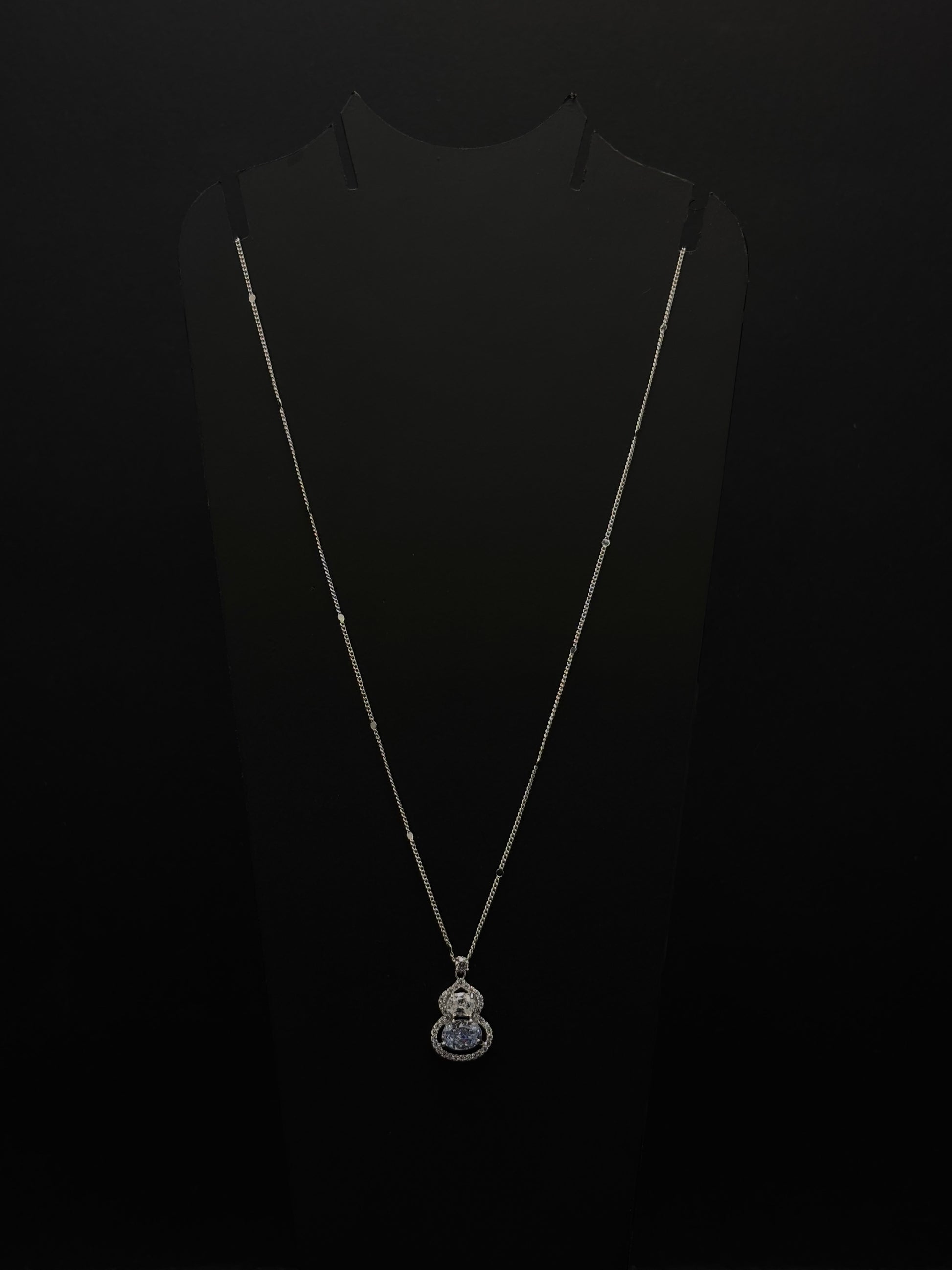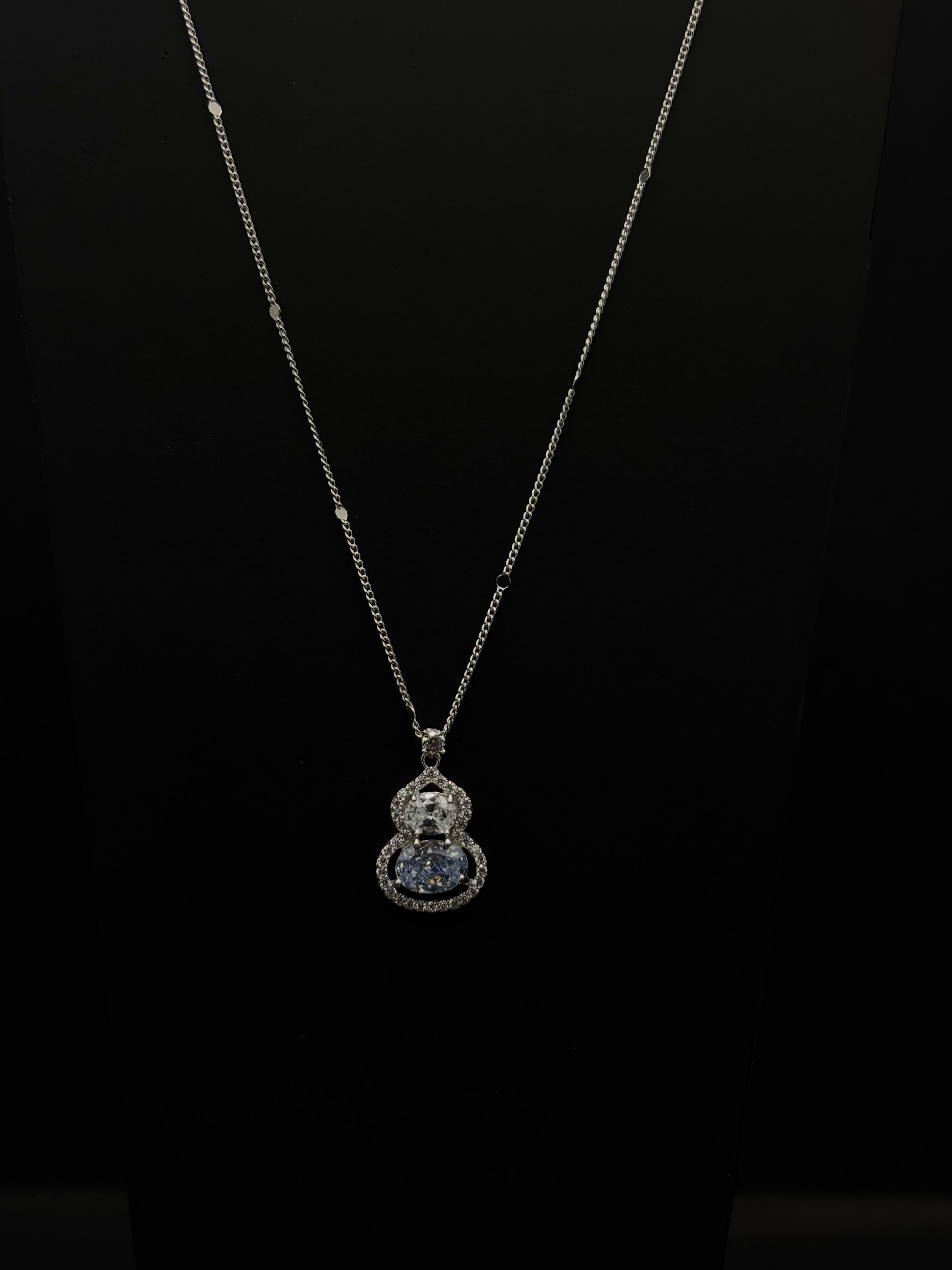 This exquisite necklace features a shimmering silver-toned chain gracefully suspending a captivating dual-stone pendant. The design showcases two prominent, brilliant-cut zircons, one set above the other, each surrounded by a halo of smaller, sparkling stones, enhancing their luminosity. The upper zircon is round, while the lower, larger stone is an elegant oval, creating a harmonious and eye-catching silhouette. Perfect for adding a touch of sophisticated sparkle to any ensemble, this necklace is ideal for both special occasions and elevating everyday wear. Its timeless design and radiant sparkle make it a truly versatile and cherished piece.