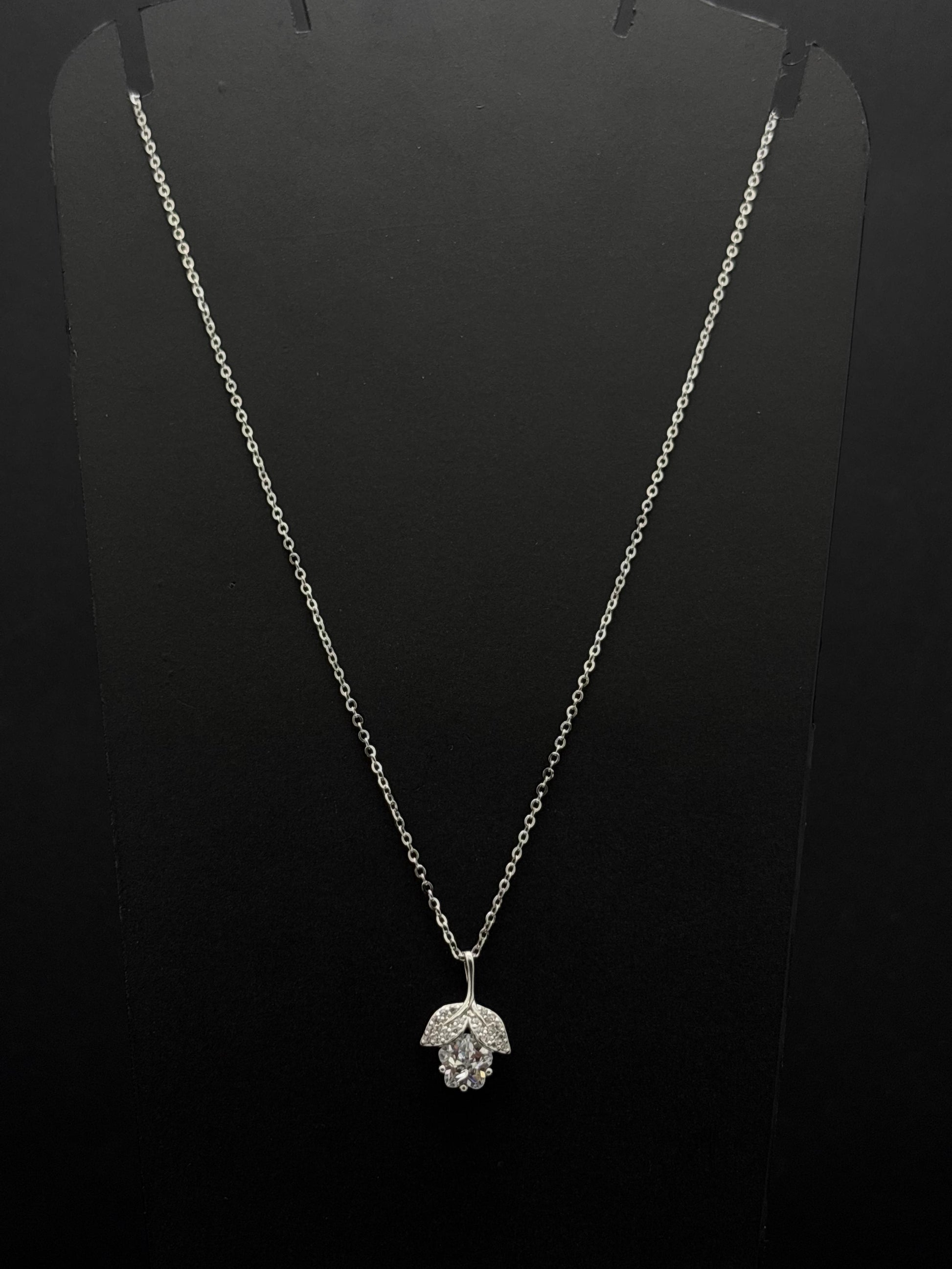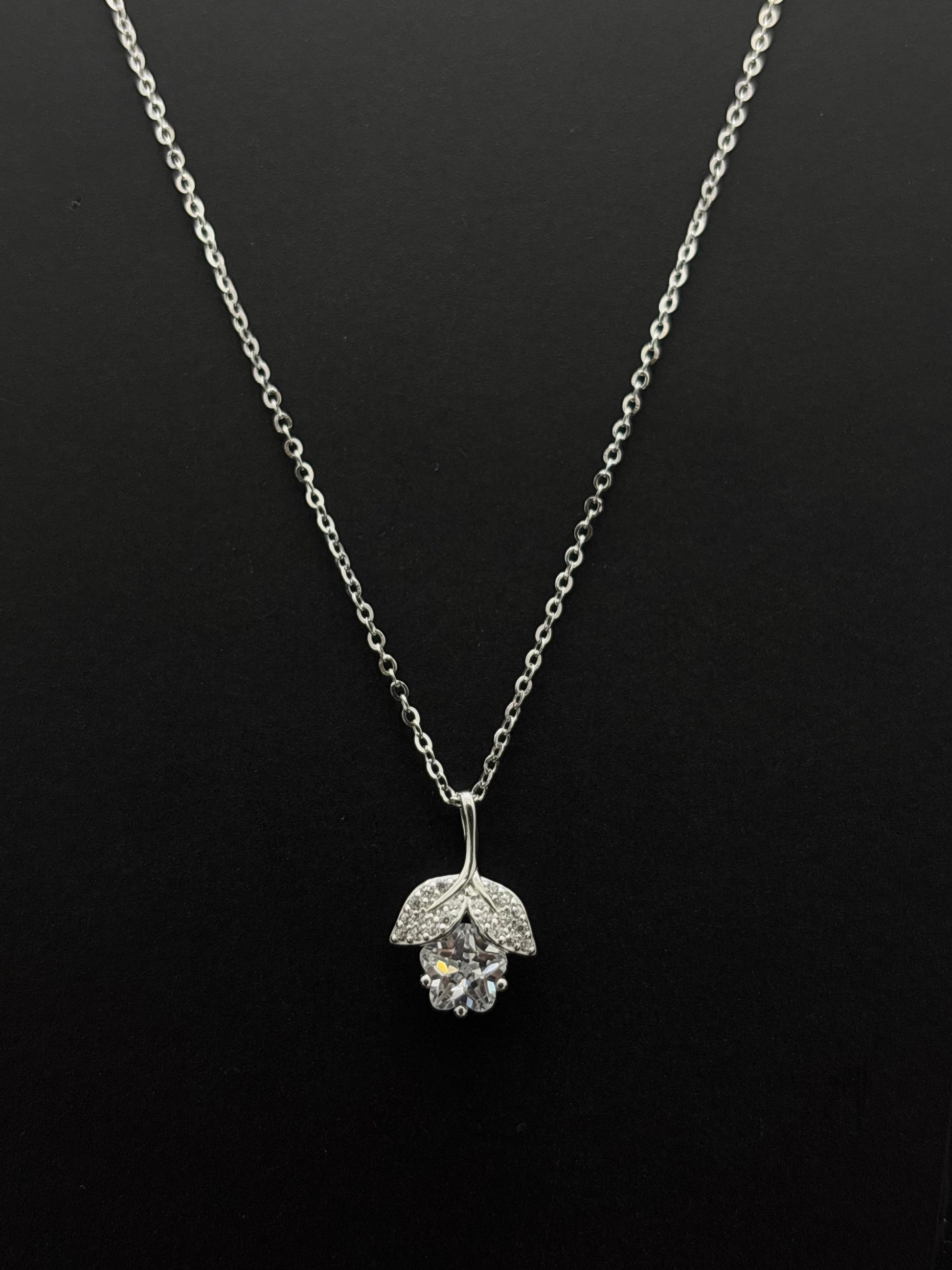 Unveil your elegance with this stunning, nature-inspired pendant. The design features a brilliant, faceted cubic zirconia (CZ) solitaire cradled beneath two delicate, pavé-set leaf petals that shimmer with every movement. Suspended from a fine silver-tone chain, this necklace is a beautiful representation of growth and beauty. It's the perfect statement piece for an evening out or a graceful touch for everyday wear.