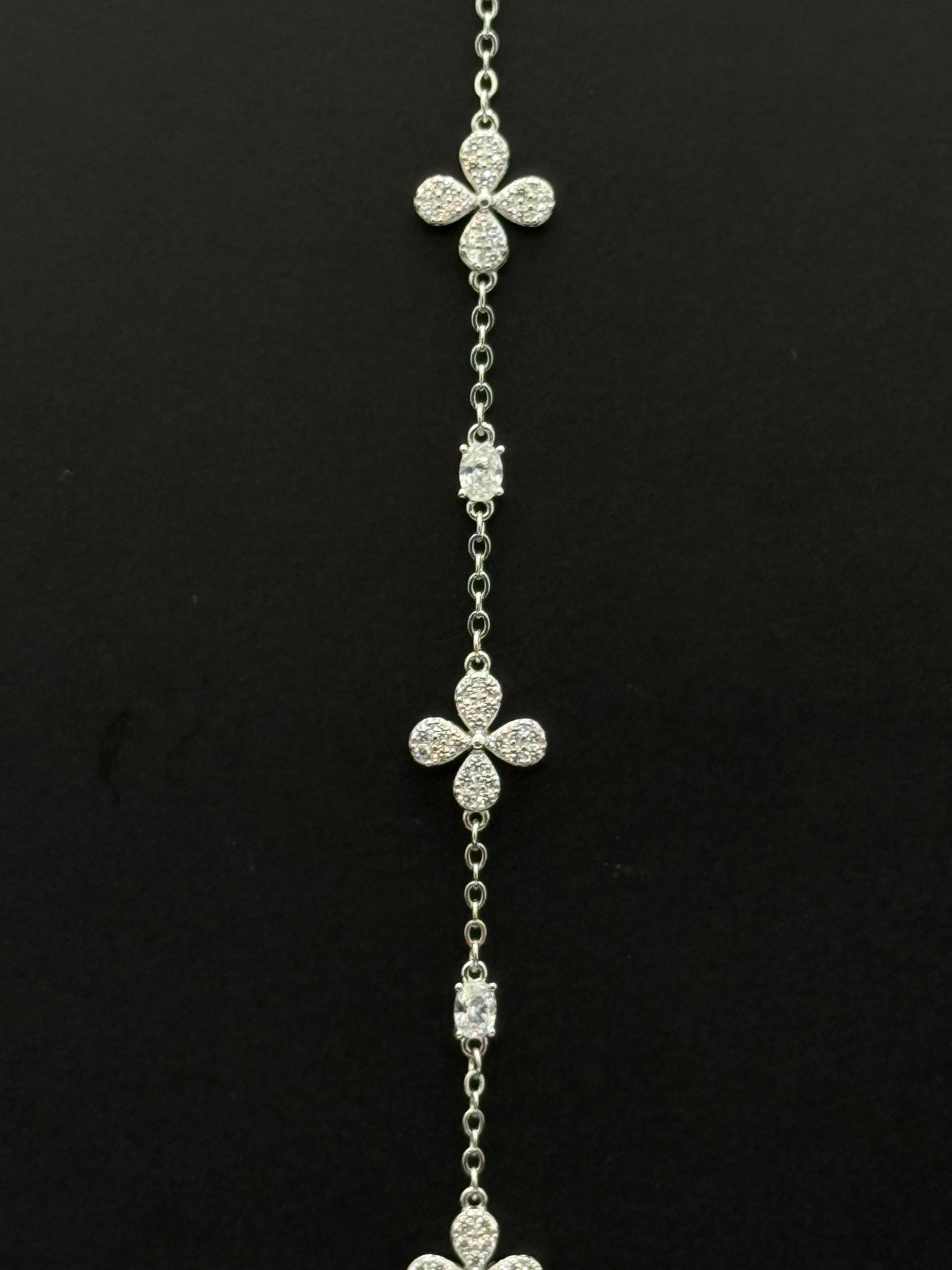 This delicate clover-themed bracelet features a beautiful and enchanting design. The silver-toned chain is interspersed with alternating motifs: small, brilliant marquise-shaped stones and charming four-leaf clover charms. Each clover is crafted from small, sparkling stones, giving the piece a shimmering and intricate look. The bracelet is finished with a simple, secure clasp. This elegant accessory is a perfect way to add a touch of luck and sparkle to any look.