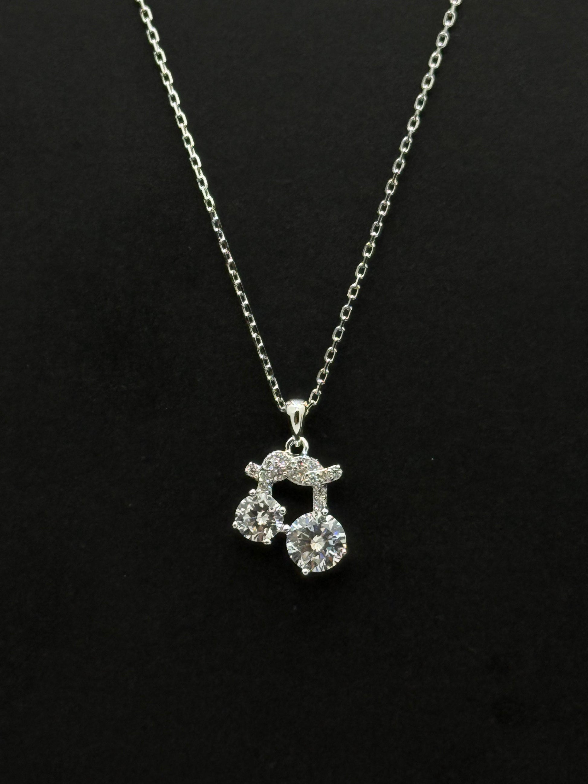 This charming and unique necklace features a treble clef musical note pendant, expertly crafted from polished sterling silver. The design is encrusted with brilliant cubic zirconia stones, with two larger, round-cut stones dangling from the bottom, creating a playful and elegant look. This piece is a perfect gift for music lovers or anyone who appreciates a distinctive and sparkling accessory
