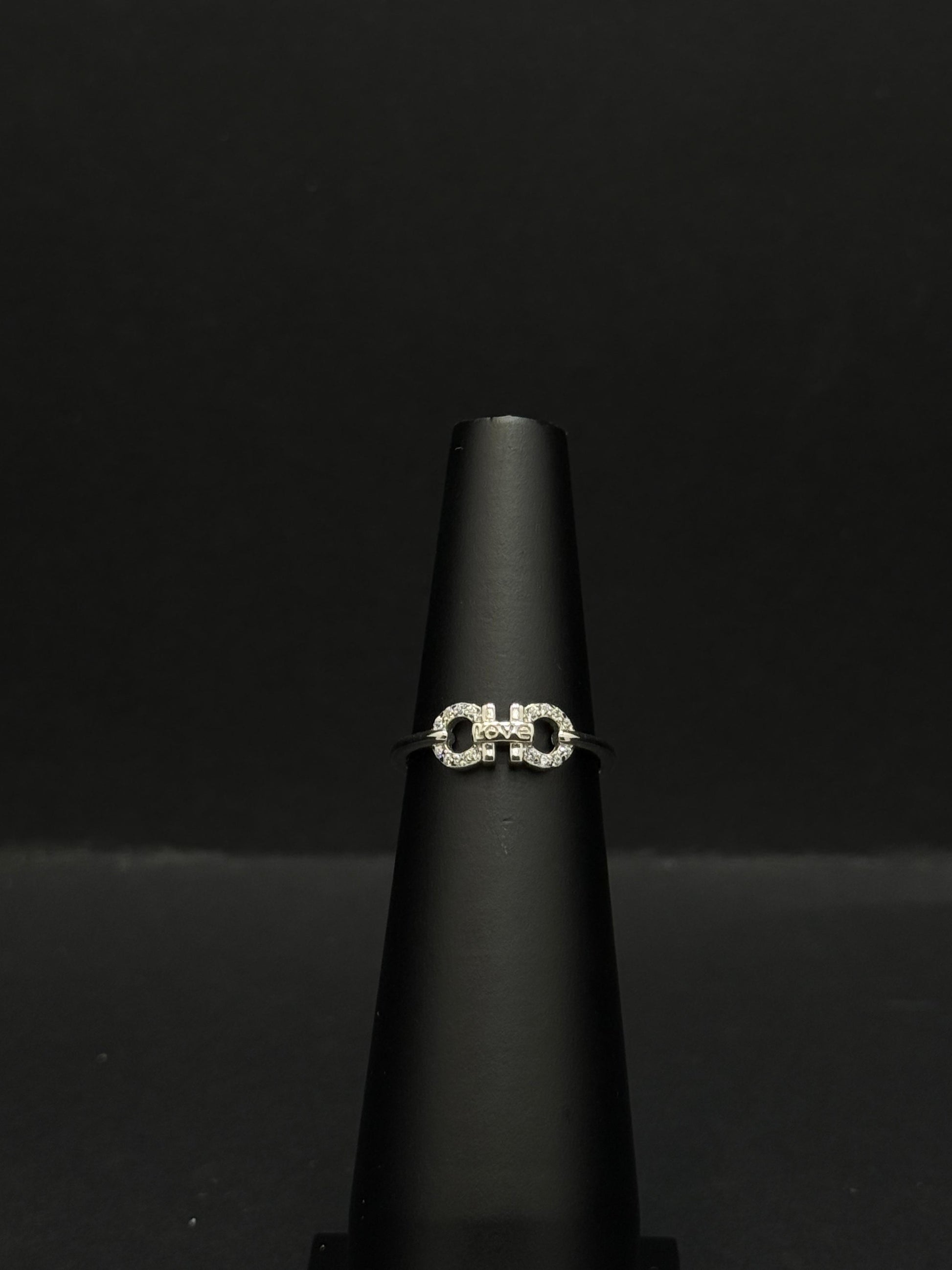 This image shows a women's ring, likely made of sterling silver, featuring a central Gancini-inspired design. The iconic double-hook symbol is embellished with small, sparkling diamonds or cubic zirconia, which adds a touch of luxury and brilliance to the piece. The band is thin and simple, allowing the detailed centerpiece to be the main focus. The ring is displayed on a black stand against a dark background, which highlights the silver's shine and the diamonds' sparkle. The design is elegant and sophisticated, suitable for a fashion-forward individual.