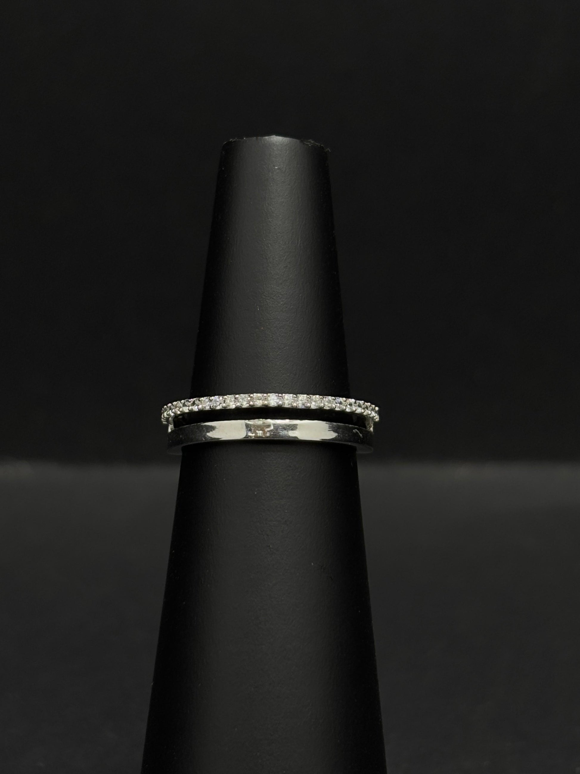 This stunning two-piece ring set offers the perfect blend of modern simplicity and timeless sparkle. The set features a classic, high-polish sterling silver band paired with a dazzling diamond half-eternity ring. Wear them together for a layered look or separately to suit any occasion. It’s a chic and versatile addition to any jewelry collection. Get two looks in one with this versatile diamond stacking set. The first ring is a simple, polished band that's perfect for a minimalist feel, while the second is a shimmering pave-set diamond band that adds brilliant sparkle. By wearing them together, you get a beautiful, layered effect that instantly elevates your style.