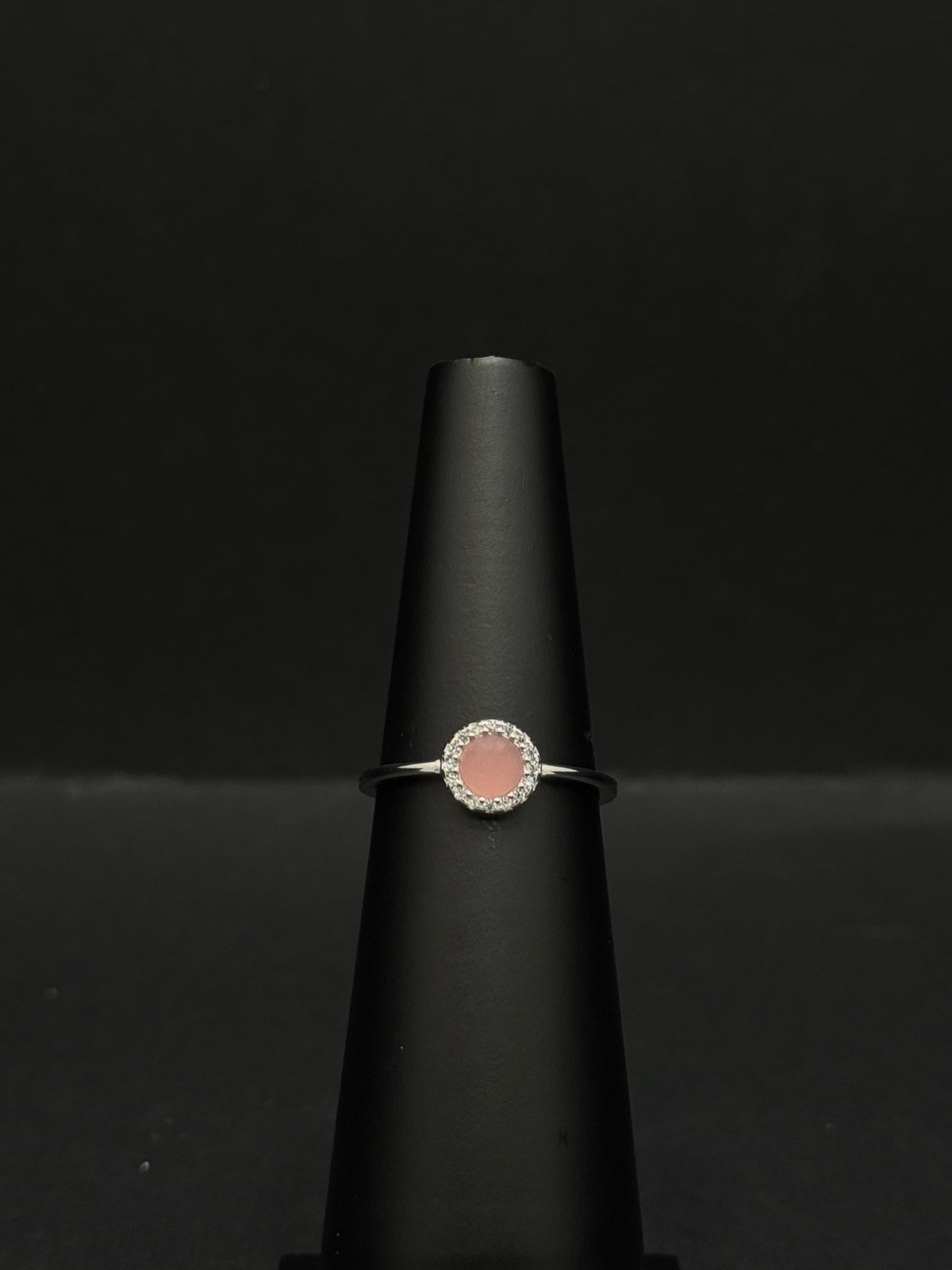 This image features a delicate women's ring, likely made of sterling silver, with a charming centerpiece. The main attraction is a circular, polished, pale pink stone, possibly a rose quartz, set in a bezel. This central stone is surrounded by a halo of small, brilliant diamond or cubic zirconia accents, which adds sparkle and enhances the stone's soft color. The band is thin and simple, which directs all attention to the elegant stone setting. The ring is displayed on a black stand against a dark background, which makes the pink color and the halo's brilliance pop.