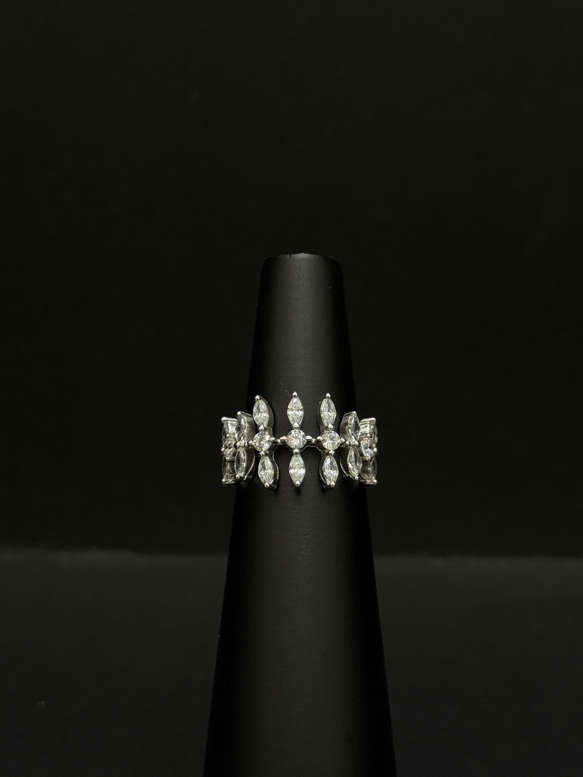 This image shows a striking women's ring, likely made of sterling silver, that features a wide, symmetrical design. The pattern consists of a central row of marquise-cut stones, which are arranged to resemble leaves or petals. These are flanked on both the top and bottom by smaller, round diamonds or cubic zirconia, which are also placed in a leafy or branching pattern. This arrangement gives the ring a delicate yet bold presence. The piece is perfect as a statement ring or as a special occasion accessory. It is displayed on a black ring stand against a dark background, which highlights its brilliant sparkle and intricate design.