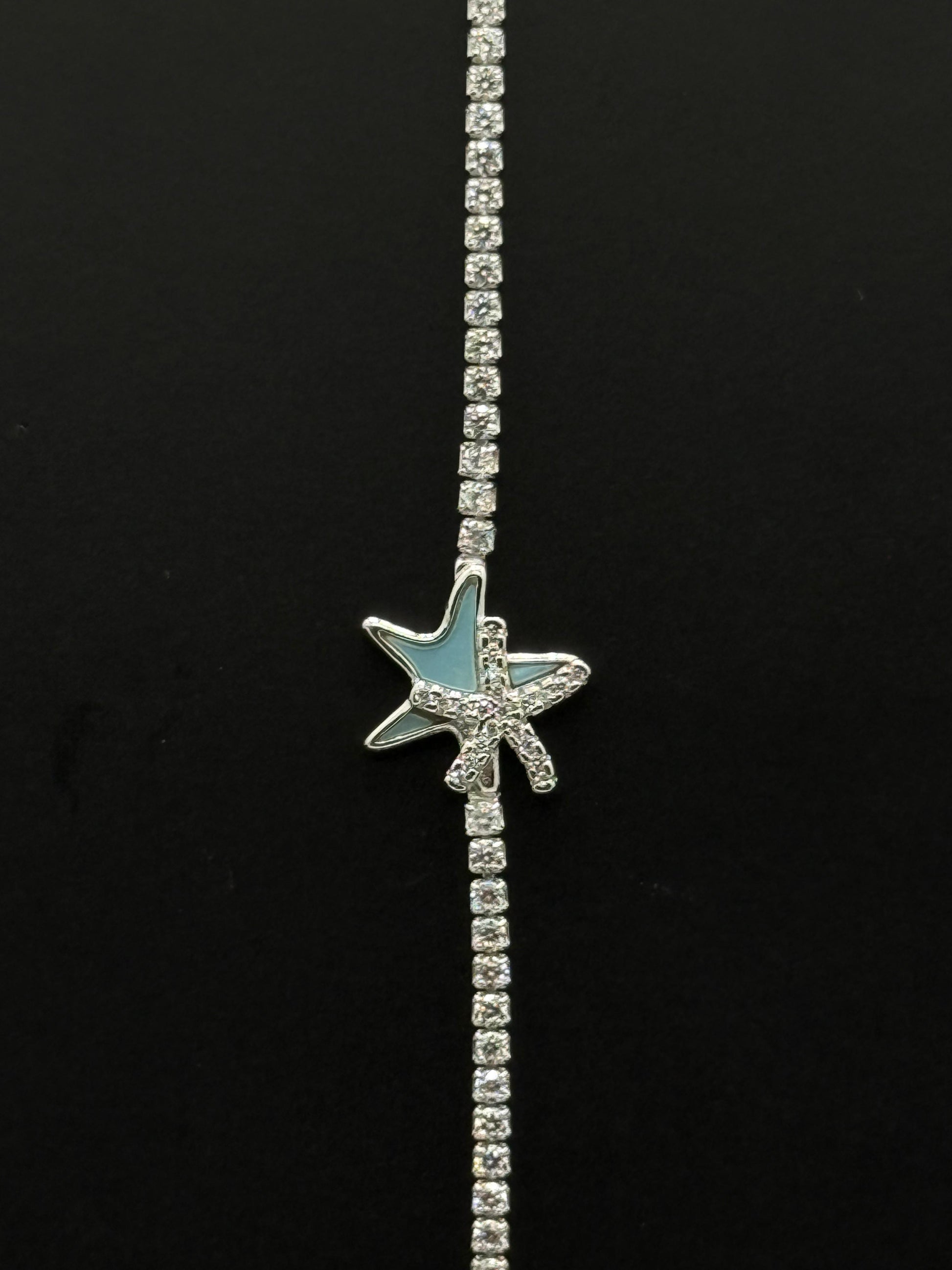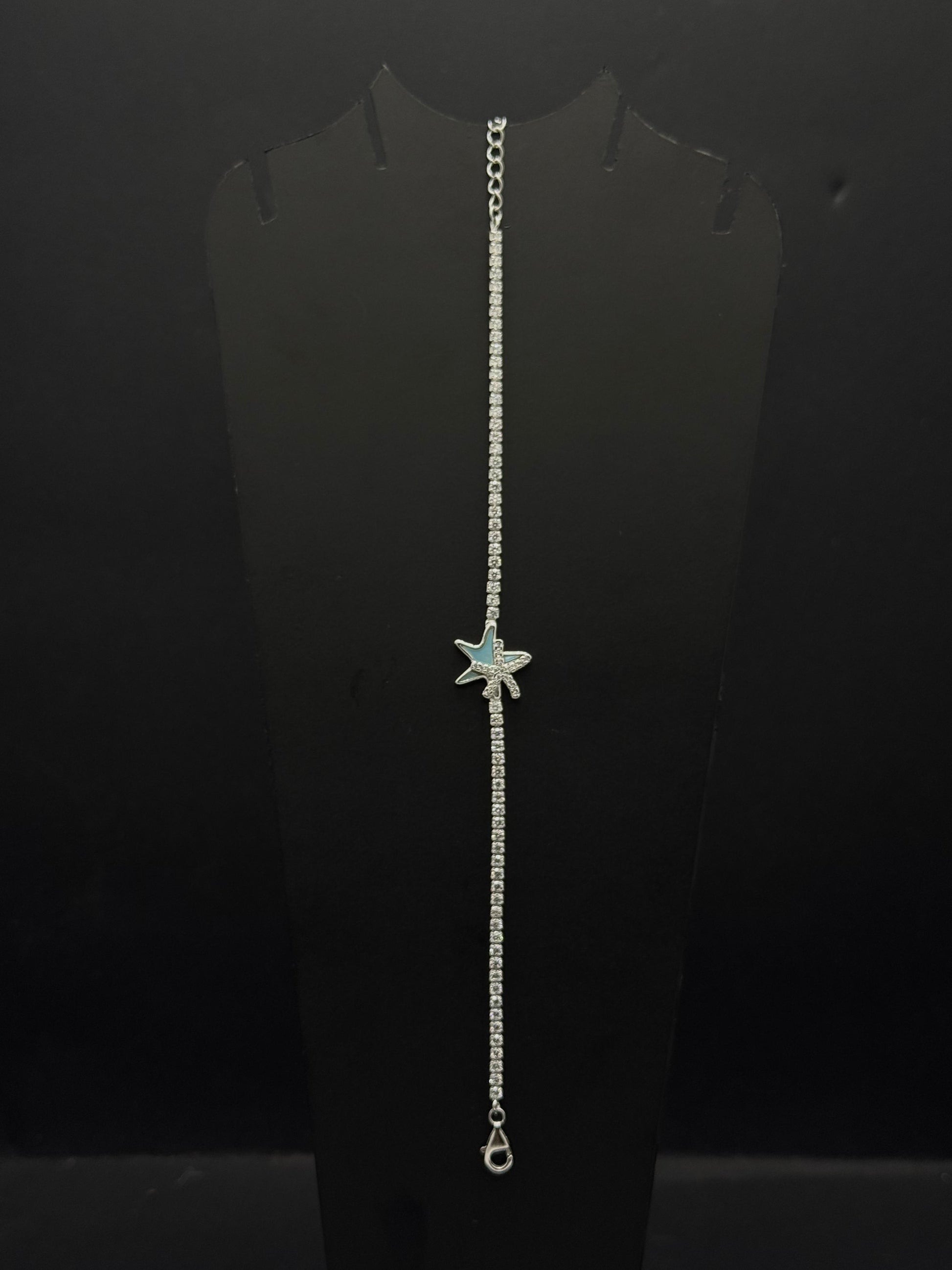 This delicate star-themed bracelet features a slender, sparkling chain. The chain appears to be a row of small, shimmering stones, giving the entire piece a brilliant, eye-catching look. The centerpiece is a charming starfish charm, which seems to have a light blue or teal color with a slightly iridescent quality. The bracelet fastens with a classic spring-ring clasp. This piece is a perfect accessory for anyone who loves celestial or beach-themed jewelry, adding a touch of whimsy and sparkle to any outfit.