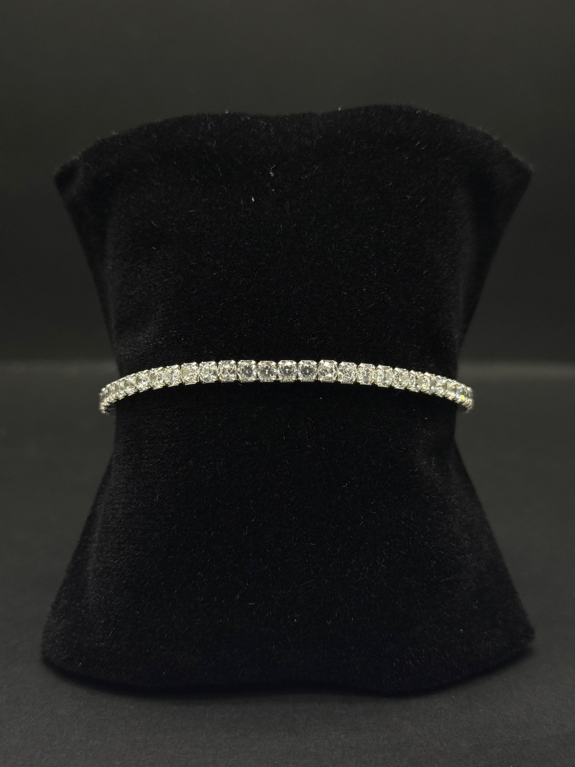 This exquisite tennis bracelet epitomizes timeless elegance and brilliant sparkle, making it a luxurious addition to any jewelry collection. Crafted from a lustrous metal, likely white gold or sterling silver, it features a continuous, flexible line of uniformly sized, brilliant-cut clear gemstones. Each gemstone, appearing to be a diamond or a high-quality cubic zirconia, is individually set in a classic four-prong or similar secure setting, allowing maximum light to enter and exit, thereby enhancing its fire and brilliance. The meticulous arrangement of these stones creates an unbroken circle of dazzling sparkle that beautifully encircles the wrist.