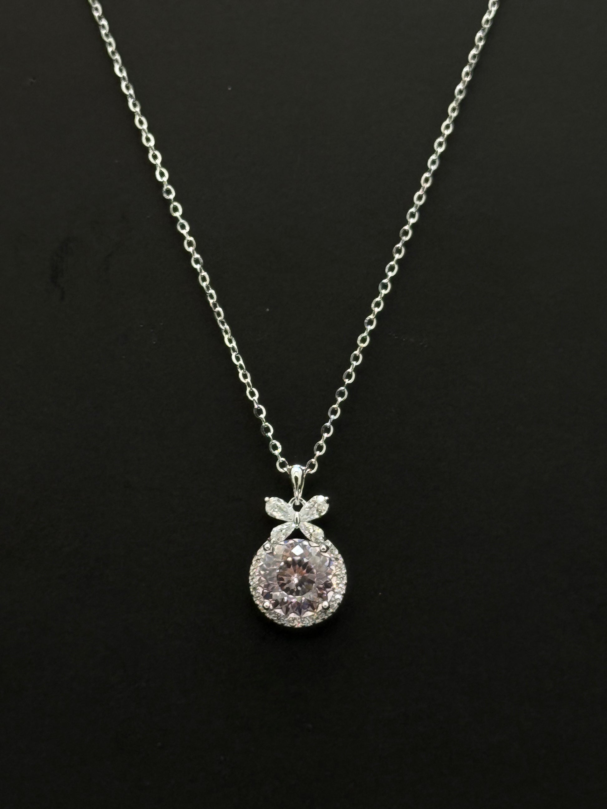 A true masterpiece of elegance and romance, this necklace features a brilliant round-cut pink diamond at its center. The precious gem is set within a shimmering halo of white diamonds, enhancing its rare and vibrant color. The pendant is gracefully suspended from the chain by an intricate ribbon-bow bail, also encrusted with brilliant diamonds. This exquisite piece combines the luxury of a genuine pink diamond with a charming, sophisticated design, making it a treasured heirloom for a lifetime.