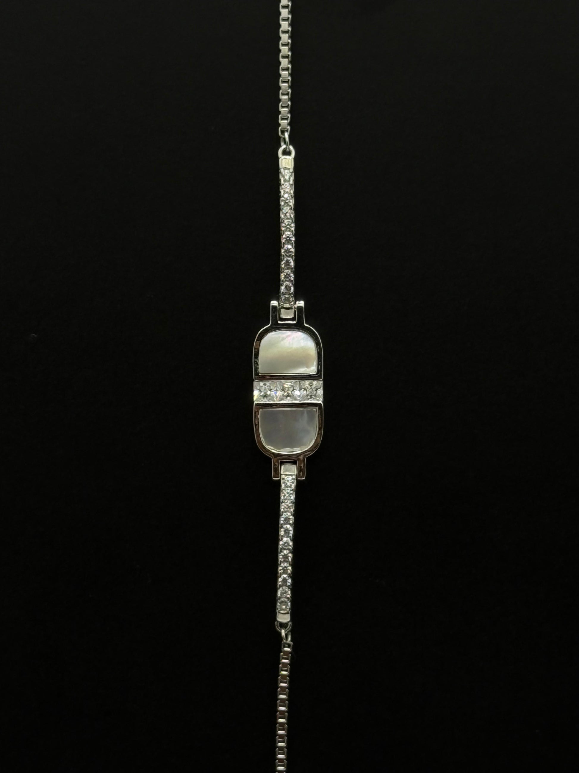Embrace modern elegance with the Zenith Crystal Bracelet. This captivating piece features a delicate, sterling silver chain that gracefully holds a sleek, cylindrical charm at its center. The charm is meticulously detailed with a dazzling row of pavé-set crystals, creating a continuous line of brilliant sparkle. Its minimalist design makes it a versatile accessory perfect for adding a touch of sophisticated shimmer to any outfit, whether worn alone for a clean, understated look or layered with other pieces for a personalized style.