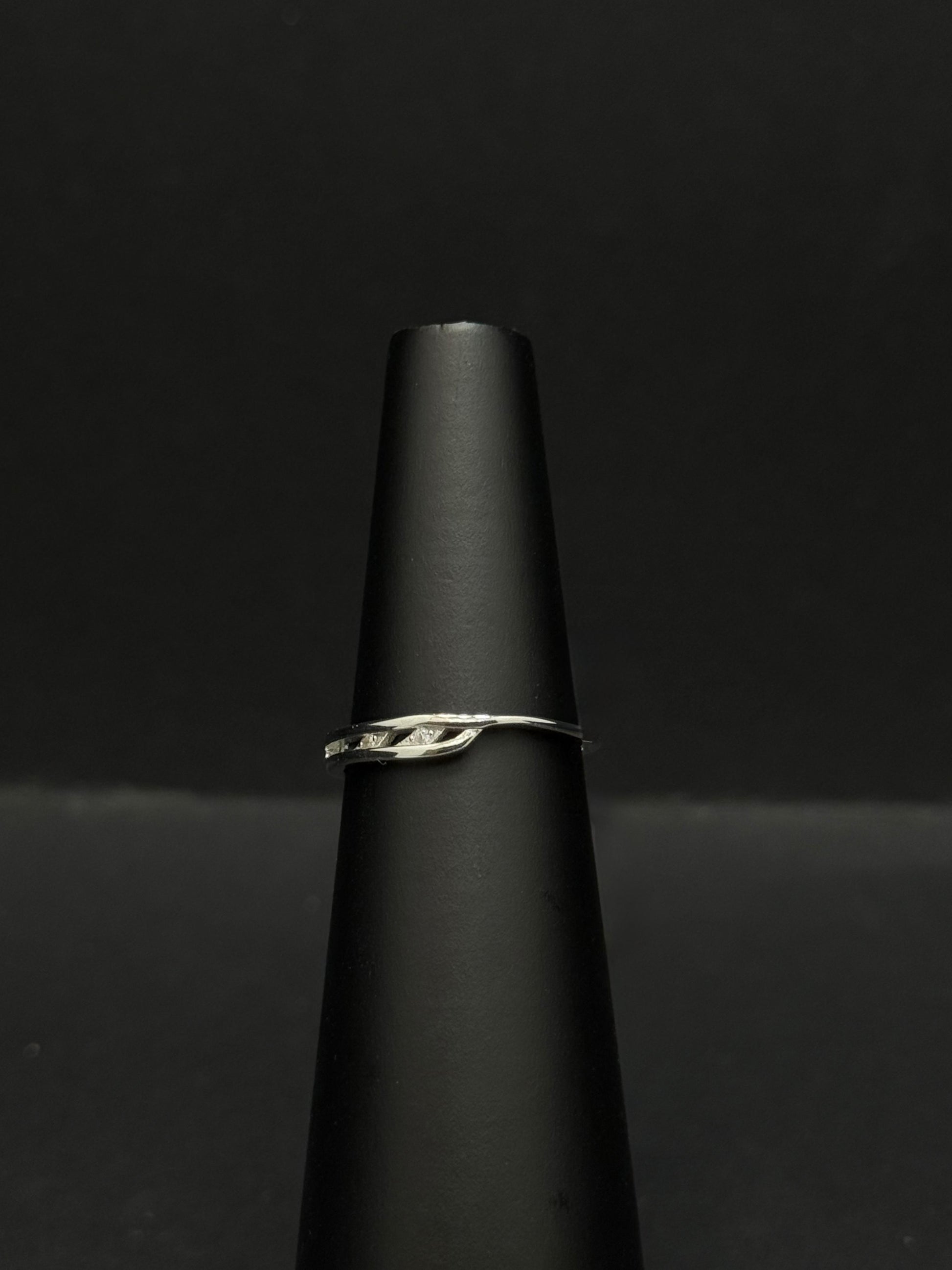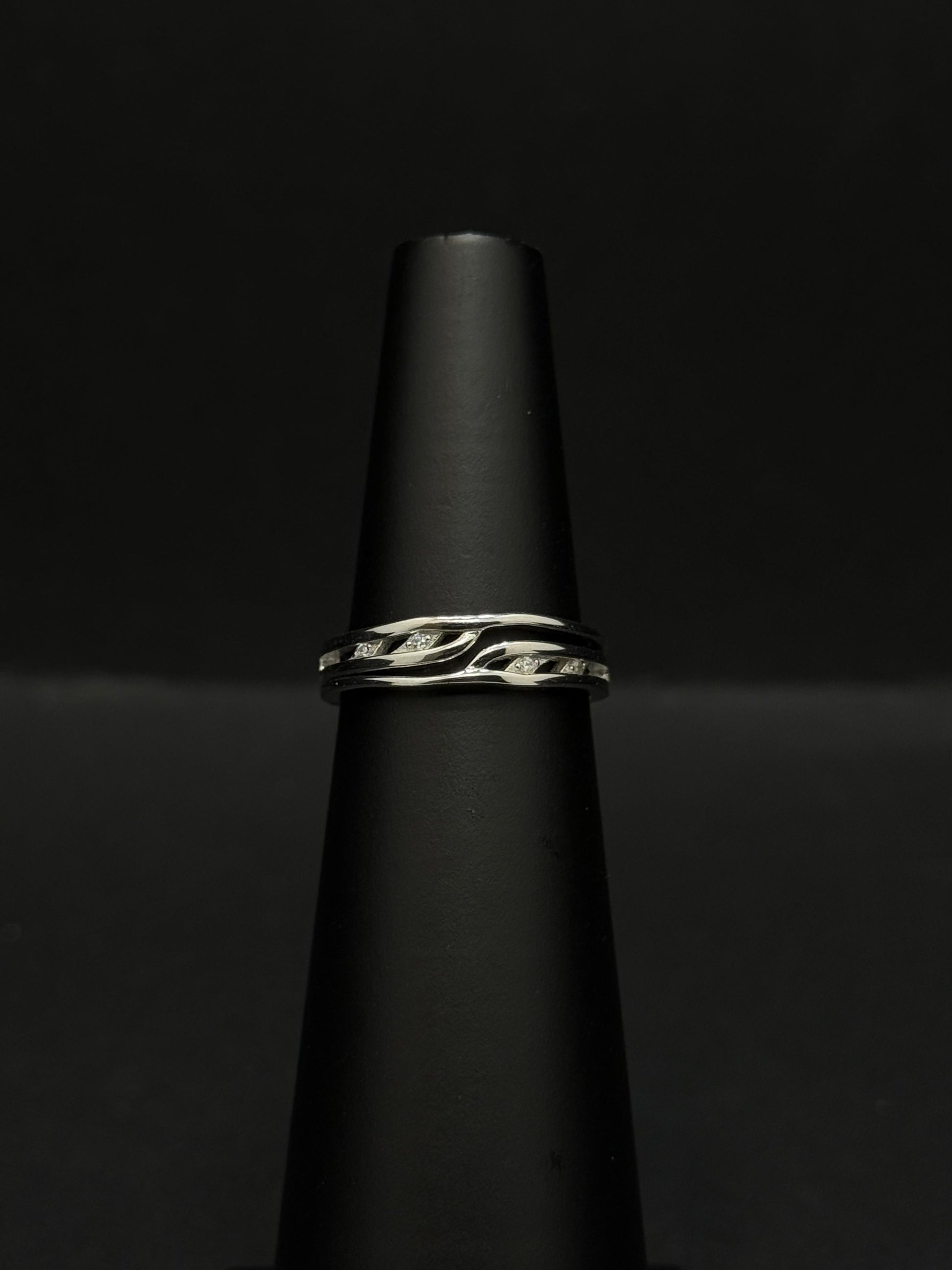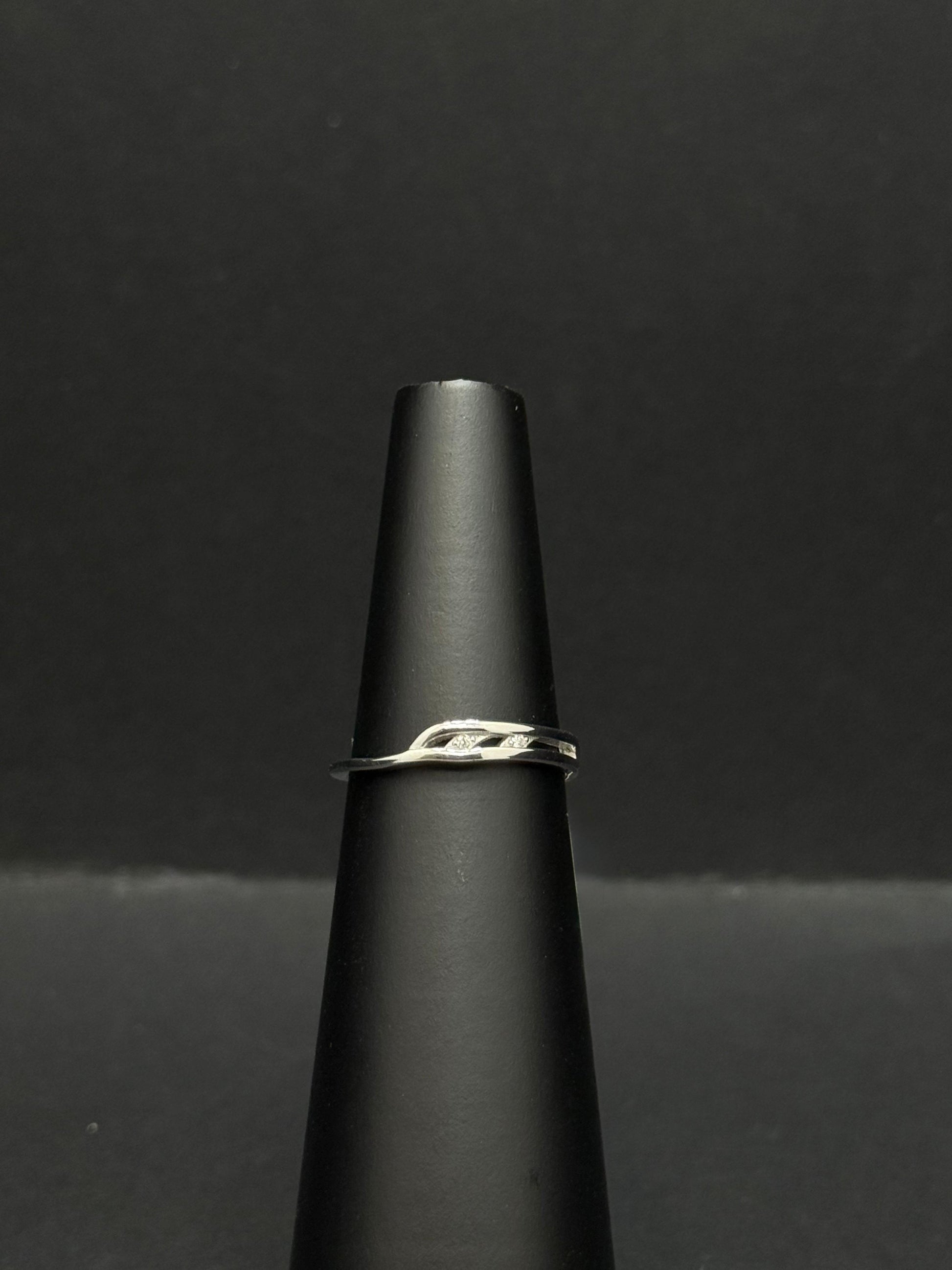 This striking ring features a polished sterling silver band with a dynamic, twisting vine-like design. The intertwining strands are highlighted with small, channel-set diamonds that catch the light with every movement. This elegant piece combines organic, fluid lines with a hint of sparkle, making it a beautiful and unique statement accessory.