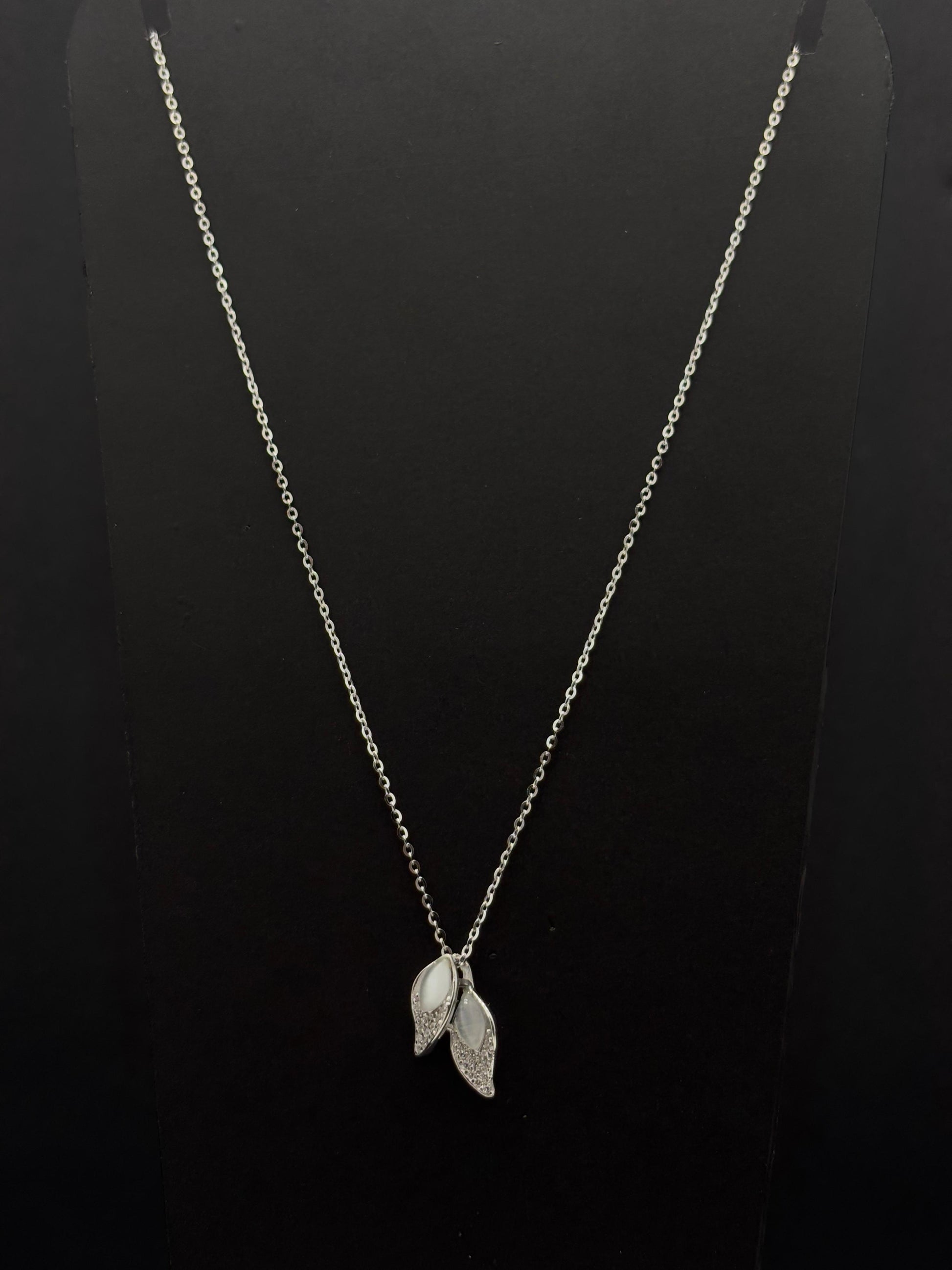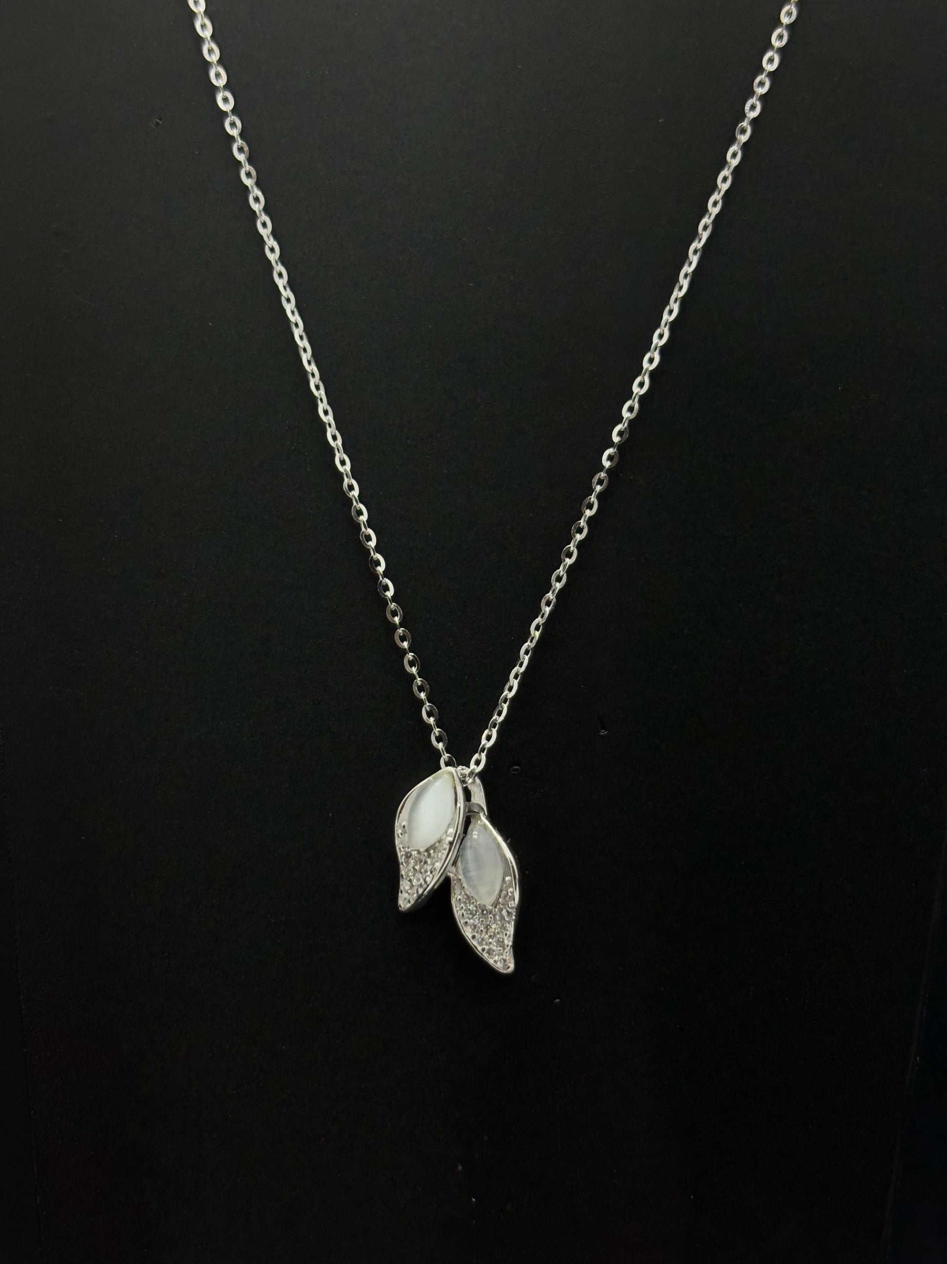 A contemporary twist on natural elements, the Two-Tone Leaf Charm Necklace showcases a pair of stylized leaves. One leaf boasts a smooth, polished white finish, while its partner gleams with a full surface of dazzling crystal embellishments. This charming duo hangs freely, allowing for subtle movement and light reflection, making it a perfect, modern accessory for any style.